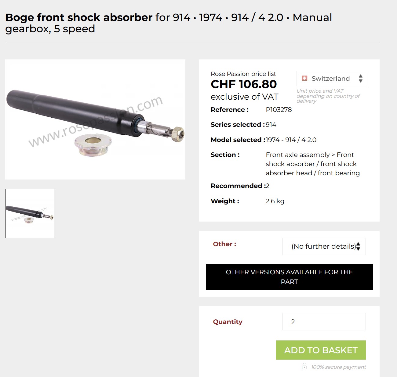 Late last year, had to replace a broken front Koni (that came with the car), my guy here suggested replacing both sides with Bilsteins and I said OK... There were already Bilsteins in the rear when I got the car. Me and everyone else who has ever ridden in this car agrees it's now way too stiff. I was looking around for alternatives and found this: https://www.rosepassion.com/en/diagrams-por...1-103278-z90088 Real Boge's?? Didn't know they were made anymore. Look reasonably inexpensive too... Unfortunately, the rears are listed as out of stock... https://www.rosepassion.com/en/diagrams-por...absorber-103279 I know AA has remanufactured both front and rear (further up in this thread). Shipping of a couple of rears to this side of the pond would be pretty expensive, and there is always the question if they even accept things with pressurized gas... @dr914@autoatlanta.com : you said above that they were manufactured in England... Any way to get them directly here in the "old world"? EDIT: just found there are also front and rear KYB units available here… worth a try? Also, I have no idea which springs/torsion bars are actually on the car. How to tell? TIA |