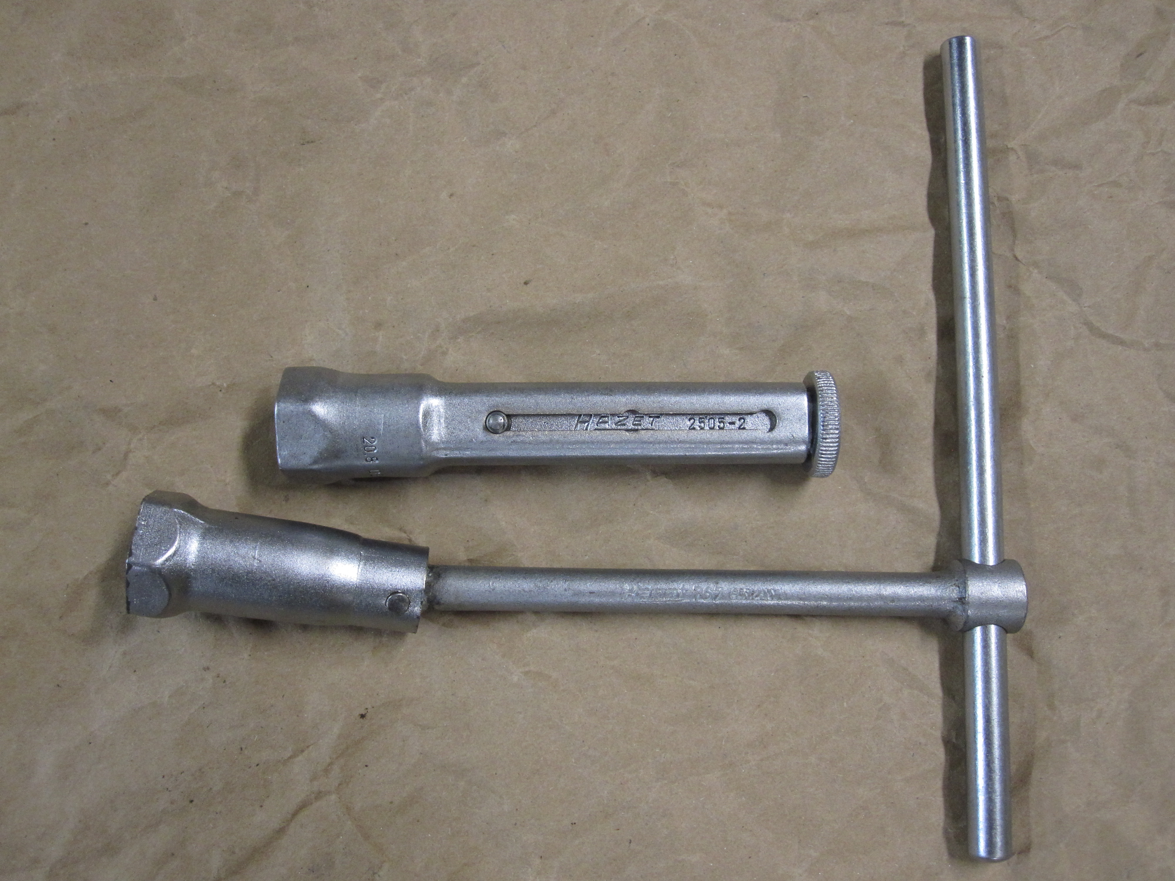 This is a BMW spark plug tool next to a 911 sparl plug tool. It should work. It uses a plastic clip inside @sixaddict Bruce I have no idea how tight a rats ass is. I did know someone would ask (IMG:style_emoticons/default/biggrin.gif) back to the subject I agree that the spark plug tool that comes in a '6' tool roll (and 911) is excellent. It even works on the lower plug of dual plug engines As for other choices Hazet has this beauty that I've used for decades. It has a built in three length adjustment feature. I don't know a current source. The T shape one is a Hazet as well, from a Mercedes Benz tool kit. Found at a swap meet. Attached thumbnail(s) |