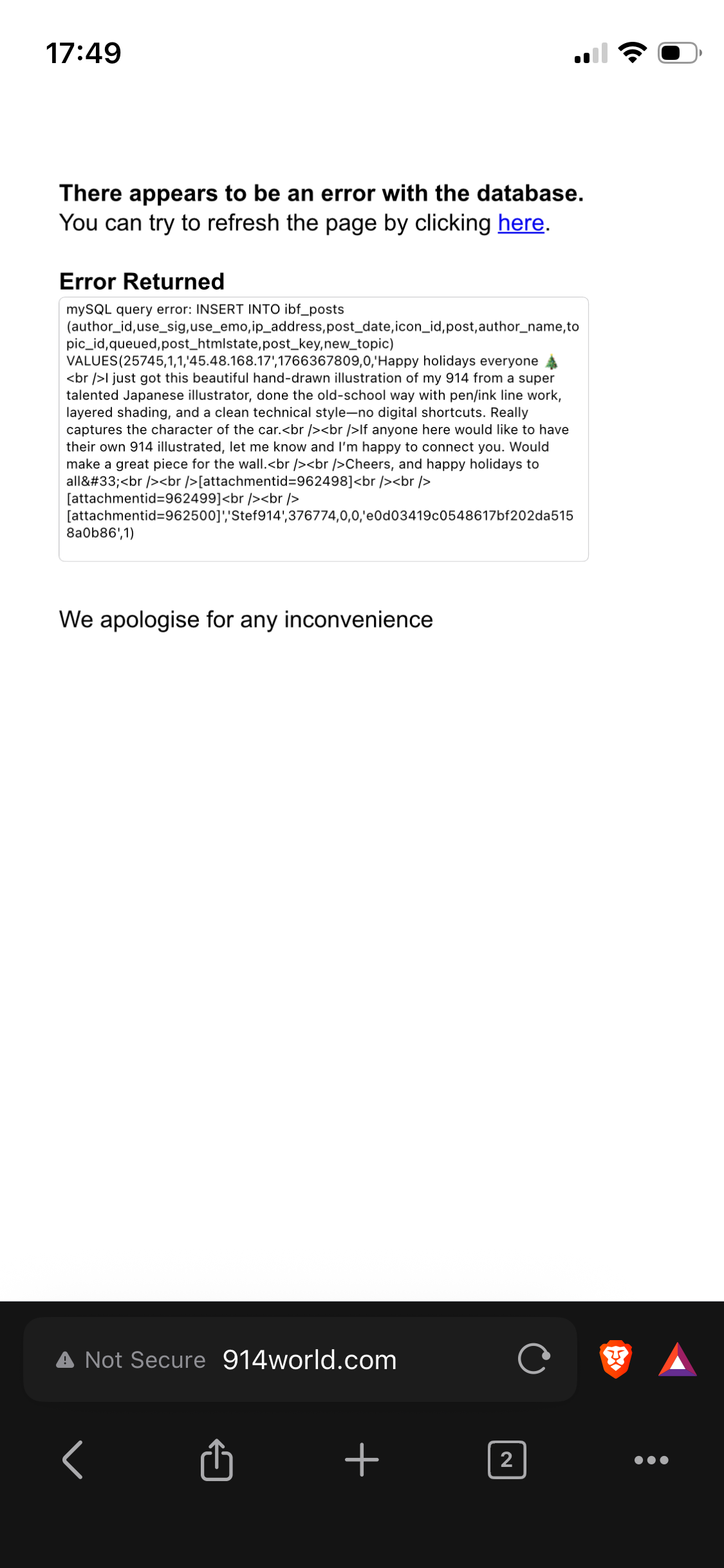 @admin just a quick heads-up: I was getting a MySQL error when posting a new thread, which went away once I removed an emoji / special character. Looks like a possible character encoding issue. Not a problem on my end anymore, just thought I’d flag it. Feel free to delete the post that didn’t go through. Thanks for all the work keeping the forum running! @Stef914 Can you get me a screenshot of the error message? (IMG:style_emoticons/default/idea.gif) |