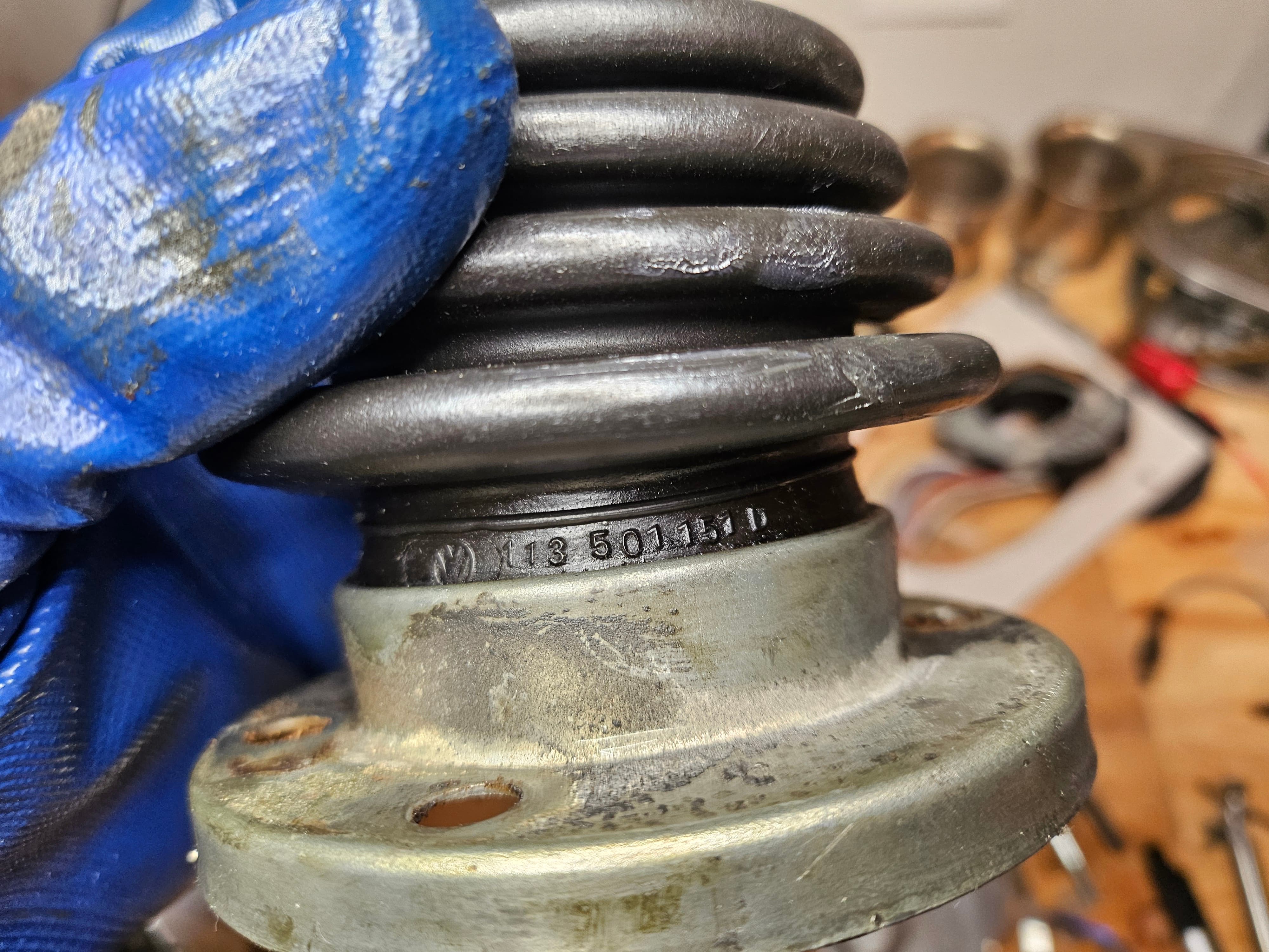 Outer CV Joint: Inner CV Joint: A few things I noticed: 1. Both CVs are stamped with VW logo (see photo). Probably original. 2. The boot on the outer CV is VW part 113501151D with only 4 bolt holes (see photo). This is from the CV with peanut butter viscosity grease. Perhaps the original boot? 3. The boot on the inner CV was a typical aftermarket part (6 holes) - so it was replaced at some point and packed with new grease, just not very much of it. Given the above, I'm wondering if the outer joint grease has never been changed, leading to the issues I was seeing. |