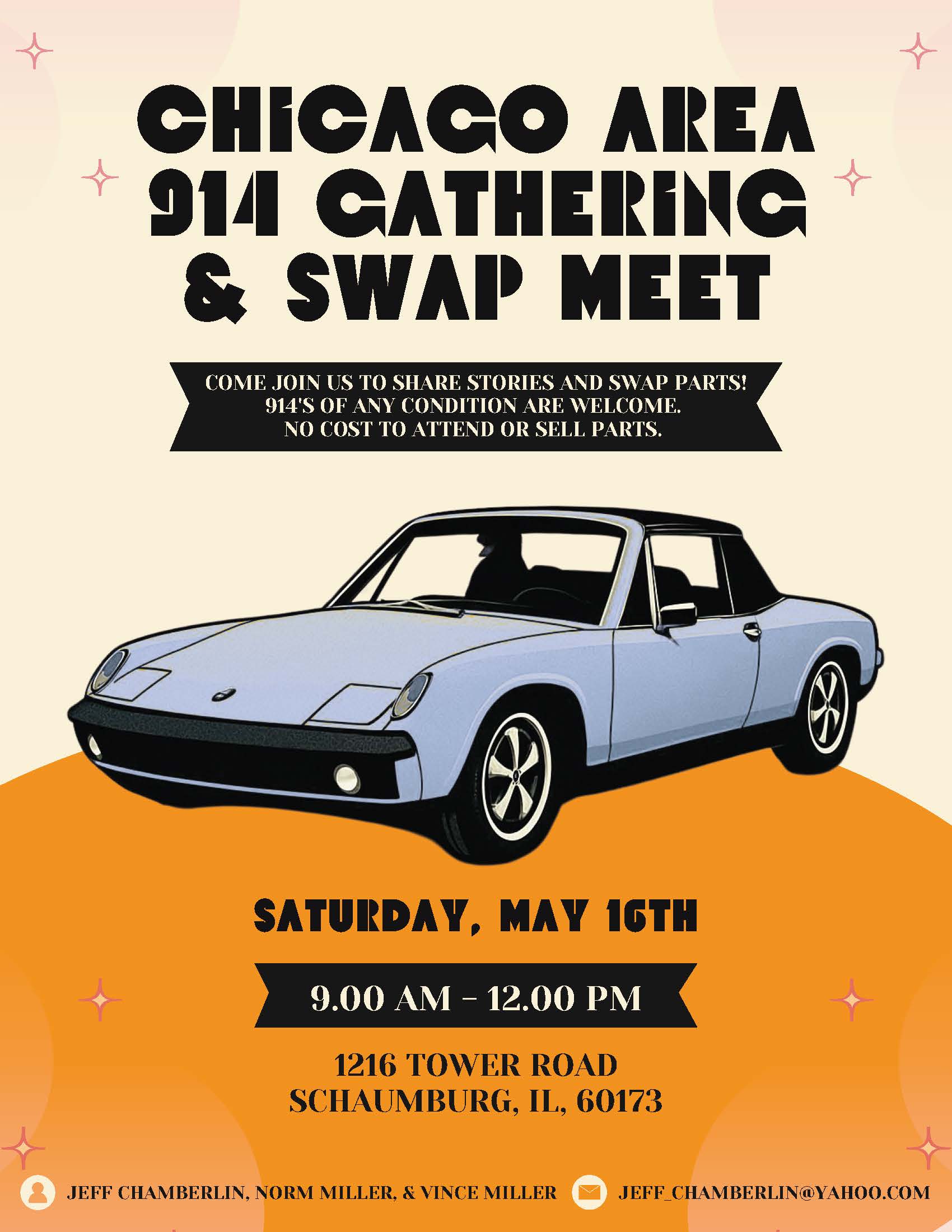 We’ve decided to take matters into our own hands. What: Chicago Area 914 Gathering & Swap Meet Where: 1216 Tower Road, Schaumburg, Illinois 60173 When: Saturday, May 16, 2026, 9:00am-noon. Hosts: Jeff Chamberlin, Norm Miller, Vince Miller Cost: Free, $0, Nada. We will bribe you with free coffee and donuts. This is meant to be a gathering of 914’s and their owners to share stories and swap parts. If you want to sell parts and don’t want to bring a table, let us know and we will do our best to have one available. 914’s of any condition are welcome - we want to see your 914! Hopefully the weather will be nice, but if not, the swap meet will be held indoors in the warehouse (shop). Appreciate a PM or a note below if you might attend as a vendor so we can plan. Thanks! |