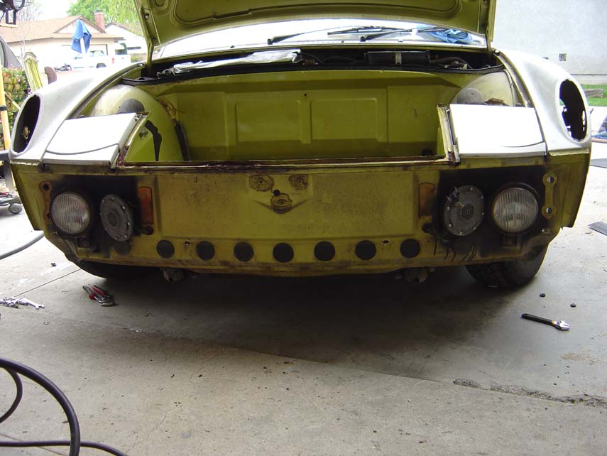 Ok, Second day of working on the car and its not even noon yet. I got the car pretty much stripped of bolt on stuff. Found rust in some places I didnt expect but should have and no rust where I thought there would be. So good and bad. It will all need to be fixed. I am open to suggestions on the rust repair that needs to be done in the front trunk gutter. Pics to follow. Here is the nose, I still have to remove the fogs and horns.