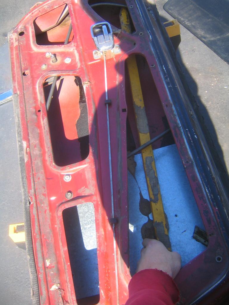heres what i found after i took off the door panel...i think someone tried to reinforce the door with this wooden stake!