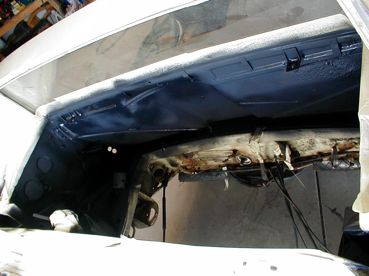 It is basically a textured spray that insulates sound and provides a chip resistant surface. It is totally paintable. The engine bay will be white just like the rest of the car. I did realize after I got this on that some of my welds from the previous day looked a little rough... to say the least. At this point I went and bought an angle die grinder. SHIT if I knew how much better that worked I would have bought one long ago. OH WELL live and learn. More after the bay is painted... next weekend hopefully. Attached thumbnail(s)