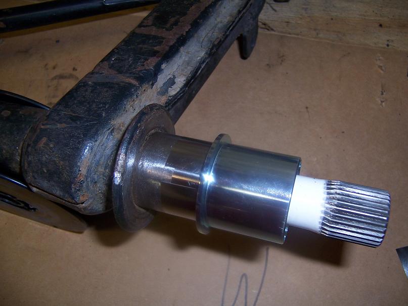 Here I'm using a .001" and a .002" shim to snug up the fit. I didn't get any pictures of the operation but from here you just slide the sleeve all the way onto the bearing surface untill it's firmly bottomed against the flange. I had to straighten up the flange a little to get good contact with the sleeve.