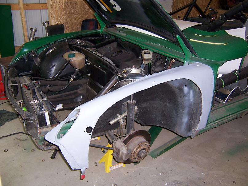 These will be replaced with fiberglass 1/4's when my budget recovers. ![]() GT Racing 1/4 panel, Rennspeed Fiberglass doorskin. Retained with DZUS type fasteners. ![]() Front IMSA Airdam fastened in place with 5 DZUS plates across top edge. ![]() |
