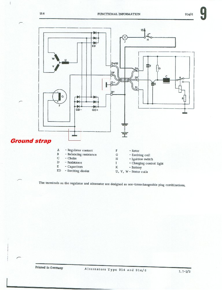 Thats what I'm gonna do, just crimp a couple of u- shaped ends on a 10 ga wire and ground from the VR attachment screw to the ground pont on the side hidden behind the relay cover... It won't hurt anything if you just go ahead and do it, but spend a minute first and check to see if you really have a problem. Check the resistance between the voltage regulator case and chassis ground first - if it's under 0.5 ohm (closer to 0.1 ohm), then the extra ground isn't needed. If you do find that it's grounded already, let me know. I'd like to figure out where it's getting the chassis ground from. I'm getting my ground from the grounding strap from alternator to engine case see post #3. Look at the following wiring diagram: http://www.pelicanparts.com/914/parts/elec...lectric_71b.jpg D- isn't connected to any case ground in the alternator. |