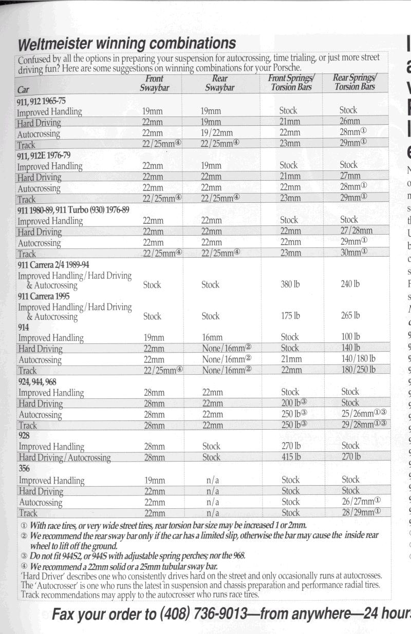 I am trying to figure out what the best set up would be for very spirited street driving. This is on a stock bodied car with factory 2.0 fuchs. Will be sticking with 4 lug. Here is what I was thinking. Rebuild front and rear calipers and install Good brake pads. Install crossdrilled rotors. Make sure the MC is in good working order and if not replace with Original. Install "T" in place of proportioning valve. FRONT-- Install new 21mm front torsion bars. Install properly grooved and greased softer PG Bushings along with zirk fittings on front A-arms. Install new Bilstein Sport inserts. REAR-- Install new Bilstein sports with coil over kit and 200lb springs. Install properly grooved and greased softer PG Bushings along with zirk fittings on rear trailing arms. Replace all front and rear stock sway bar bushings with new OEM. Buy, balance and install 4 new 205/60-15 tires and allign. Corner balance. Check and repalce any other wear items that might need it like ball joints and wheel bearings.