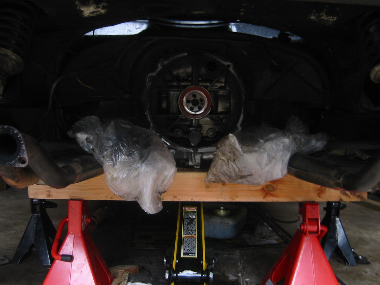 Here is a pic taken when I was about to remove the engine. CVs in bags, muffler off, 901 off, jack in place, and 2 x 4 support. I only had the one jack, so I used the engine bar on one and and a 2 x 4 on the other end to balance. It worked out great being solo - totally saved my heads when the engine broke free and lurched 3 inches down. The 2x 4 and engine bar rested on their supports before the engine could tilt any further on my small jack...almost tweaked the HEs real bad which would have pulled an exhaust stud and made a hole in my heads (no leaks now - it's all good).