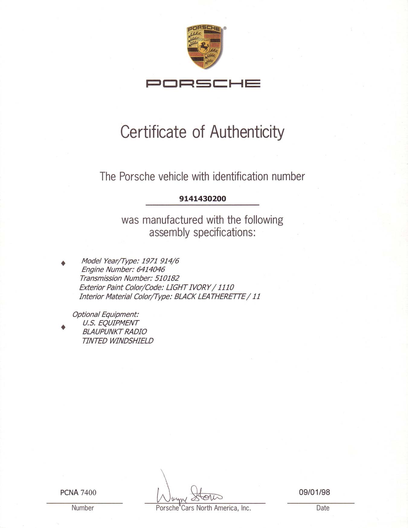 Some of us with 914-6s apparently have no chassis numbers. The chassis plate is blank and the trunk floor is not stamped. I think you asked for '71 and '72 cars in particular. Here is my certificate of authenticity for my '71: Attached thumbnail(s)