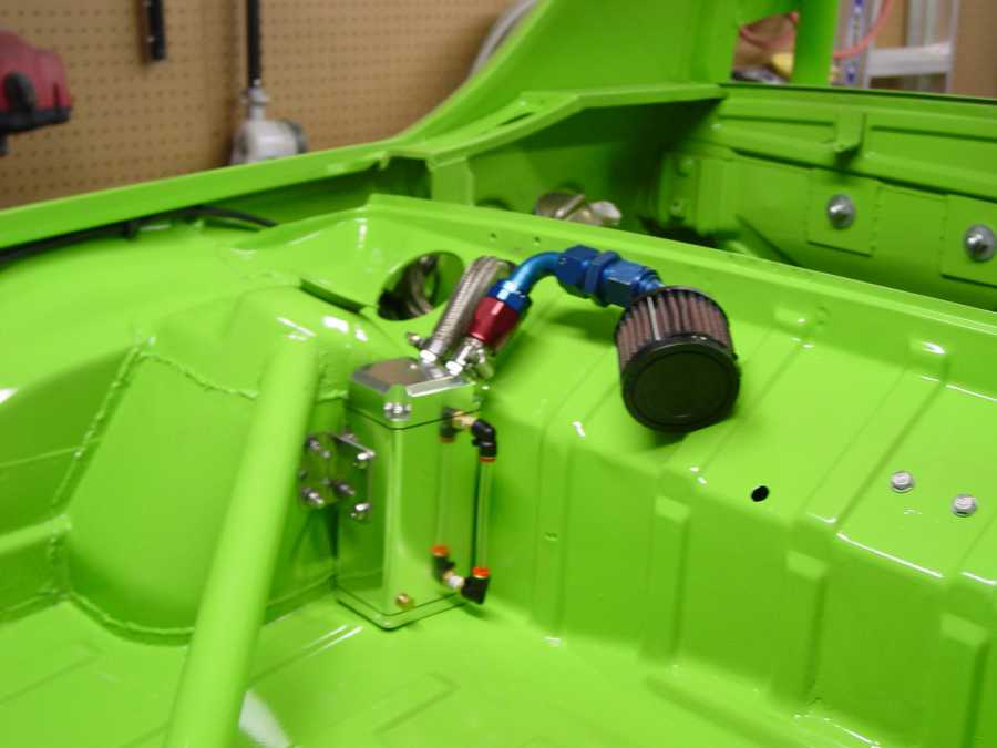 - things not pictured are wiring the tank and fuel pump, also installed the sub belt eye bolts..... DONE -wired the HPV ignition, interestingly enough the relay for my hot start kit worked for the relay on the HPV....WHO KNEW??..... DONE -finished plumbing the fuel line to the rear of the engine bay.....DONE -installed the oil catch tank and plumbing.....DONE -installed the steering column and the momo adapter and the quick release, greased all bearings cleaned ETC ETC ETC...smooth as silk now....DONE -installed 911 dash and built the lower cover panels as well as installed the Moroso OVER PRICED fricken 5 switch panel.....DONE |