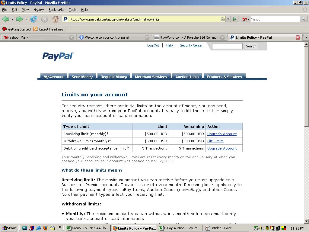 Also ... there are fees associated with the Premier Account: Receive payments funded by Credit Card, Debit Card or Buyer Credit: 4.9% + $0.30 USD (limit of 5 transactions per 12 month period) ** for domestic or U.S. transactions ... that would be an additional $44.40 on a $900. payment Pay Pal states that I also have a $500. limit that I can take out of the account per month (See attached pic). You gotta realize that Pay Pal IS a bank (IMG:style_emoticons/default/dry.gif) Jamie, if your friend is here in the US, just have him send a Bank Check or Money Orders (IMG:style_emoticons/default/confused24.gif) Attached thumbnail(s) |