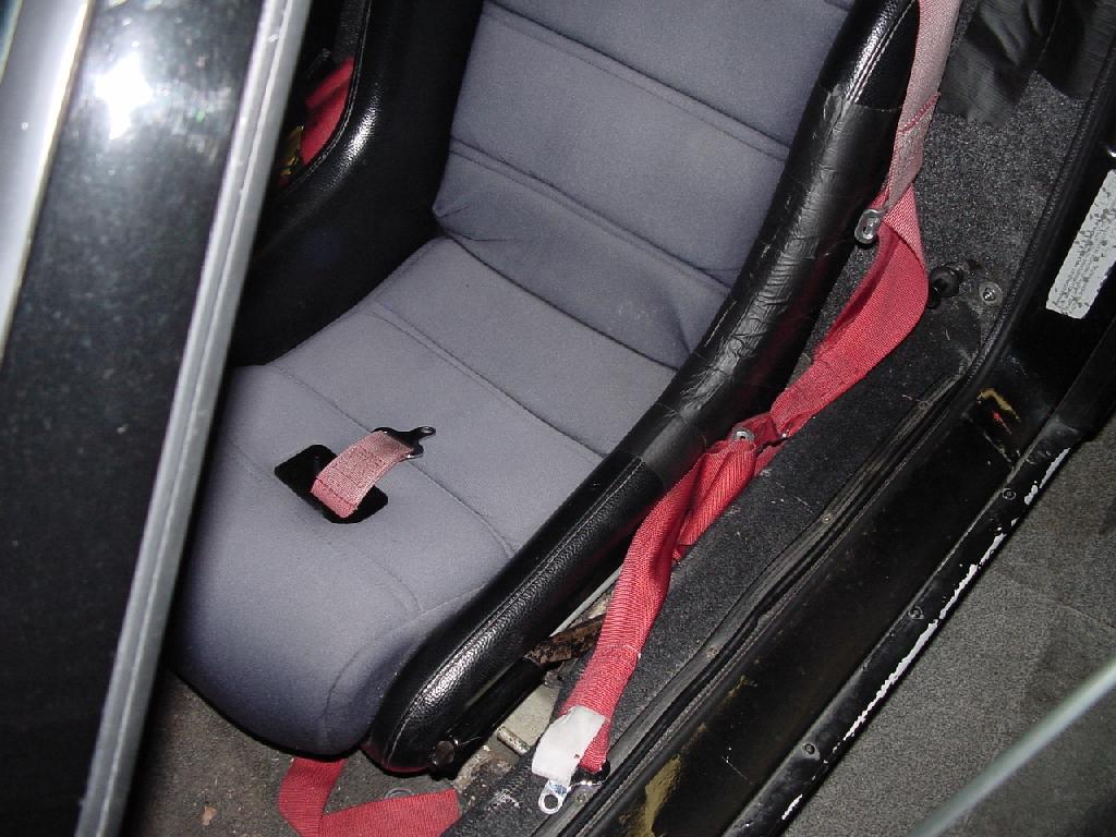 Those intersted in the Corbeau Classic II's should be aware that you can order them with a sub strap hole from the factory. Oh yeah, as a daily driver, the vinyl does not hold up (see the gaffer's tape below) and the color fades pretty quickly, plus the foam in the lumbar region compresses pretty quickly. Once the foam compresses, you can feel a crossbar at the rear that hits me right in the coccyx. Also the seat rails need to be filed out to fit larger bolts that are offset slightly from the stock locations.