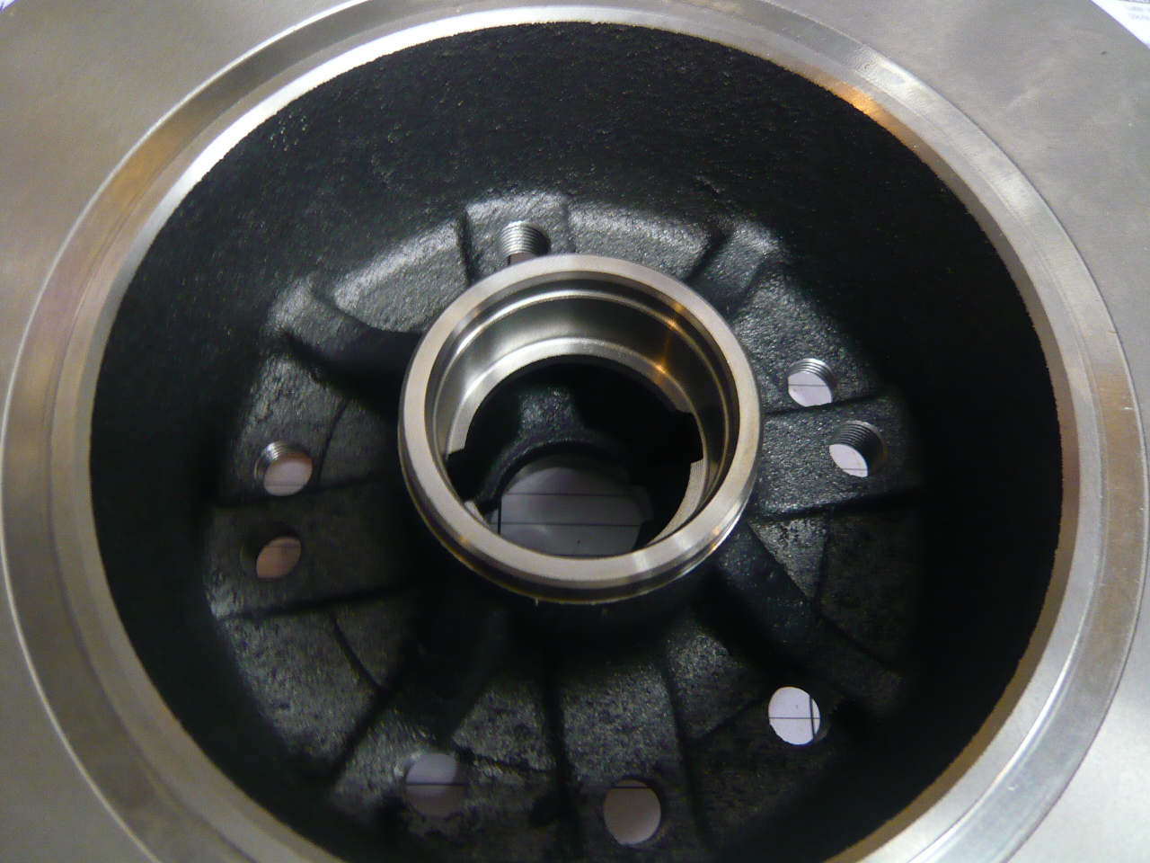 <<My preference in doing this now would be to machine the rotors from the front and use screw in 14x1.5mm studs (yes, I can hear a few screaming in horror as I type this). IF DONE PROPERLY this would be my preferred method. First off; it will not cut into the webbing on the backside. Secondly; to do it properly would require Loctite “Red”… the permanent stuff. This is, after all, a permanent application. Late model rotors will need the centering ring machined off to work with Fuchs. This requires a bit more time and money at the machine shop but, a fairly common and easy practice.>> http://www.914world.com/bbs2/index.php?showtopic=105728 I decided to do a set this way and I'm "very" pleased with the results all around. First, looking at the backside you can see none of the webs have to be cut out or removed. In order to press in a Verbus stud a major amount of the webbing on two webs had to be removed. Not here: The key to doing this right is to use the "Red Stuff": Here's the application on the threads: Finished product: Bottom line: 5x130 pattern with a 14x1.5 tap, 10 14/14x1.5 studs, Red locking compound and away you go. These are also late rotors that have had the centering ring milled off to accomodate the Fuchs. Yeah they're not Verbus but in this configuration I'll guarantee them against the life of the rotor (and then some). What I mean by and then some is, if you go through a rotor you can simply heat these with a MAP torch and remove them and use them on the new setup. Again, if you're intent on using 914 rotors, I think this is not only the best way to do this (more meat on the back of the rotor and very clean install) but, quite accessable for the home mechanic. You just need to pay the machine shop. (IMG:style_emoticons/default/wink.gif) |