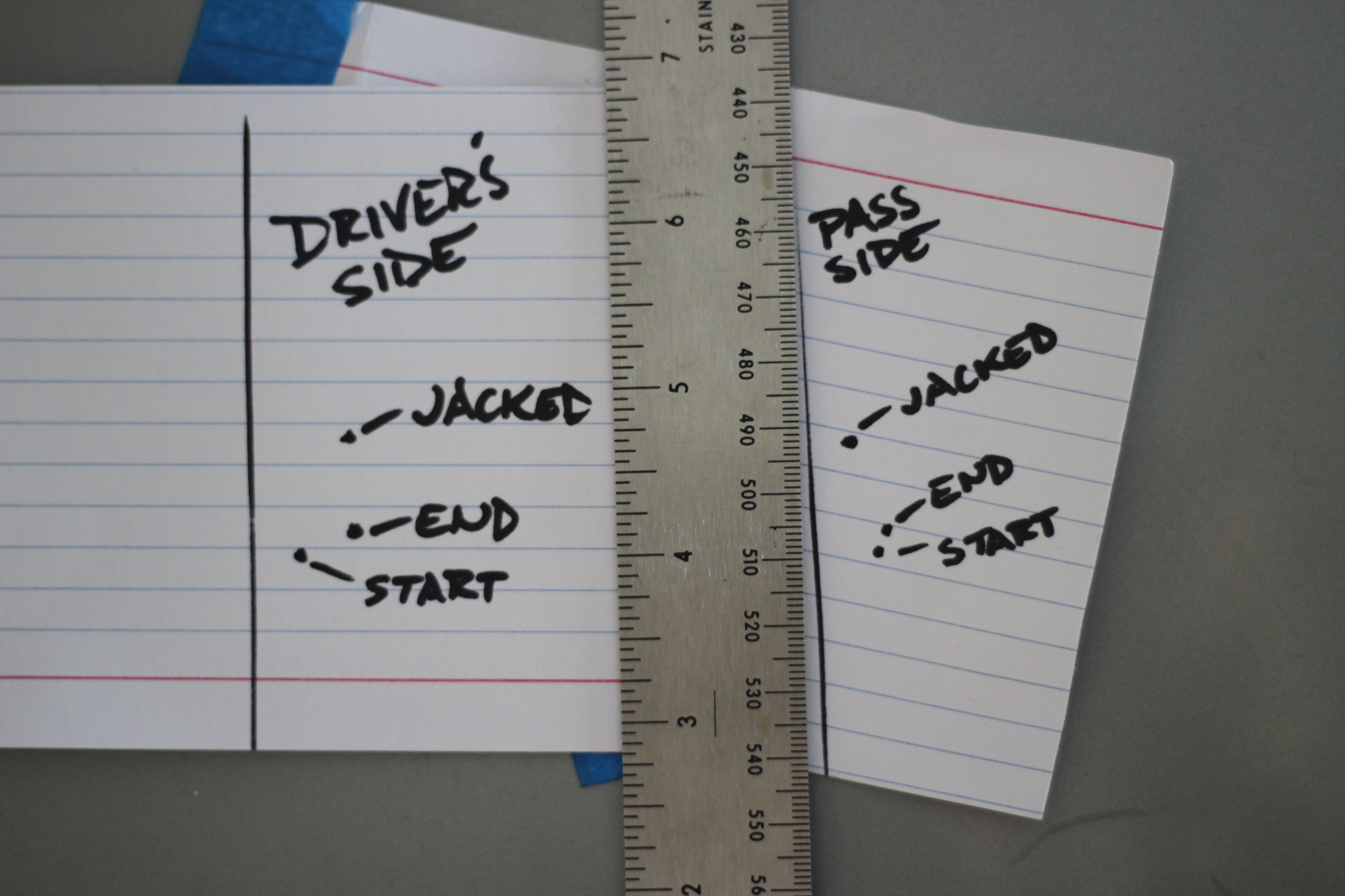 Did a quick and dirty check to see how flexy my frame is. Just stuck a laser pointer on the rear fender with a magnet and aimed it at a notecard taped to the front fender. Marked the position of the dot, then jacked the wheels off the ground and marked the position of the dot again.