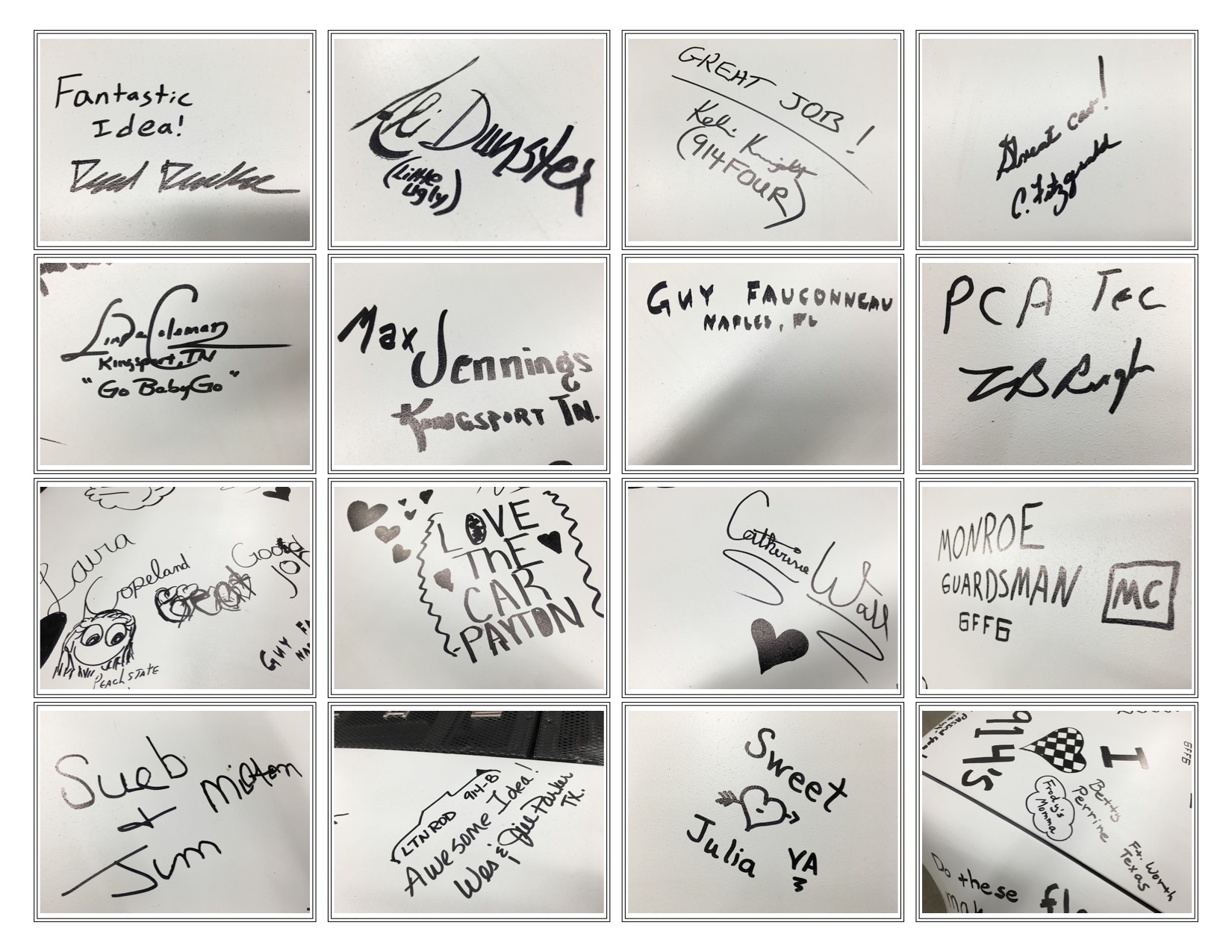 The paint is white Plasti-Dip flat white, sprayed over "not ready for show" body and paint work. Then ask all to sign the car with black markers. I had fun with this, and I had great response from everybody who wrote on the car, some had to be convinced to do that. (Plastic-Dip paint peels off) |