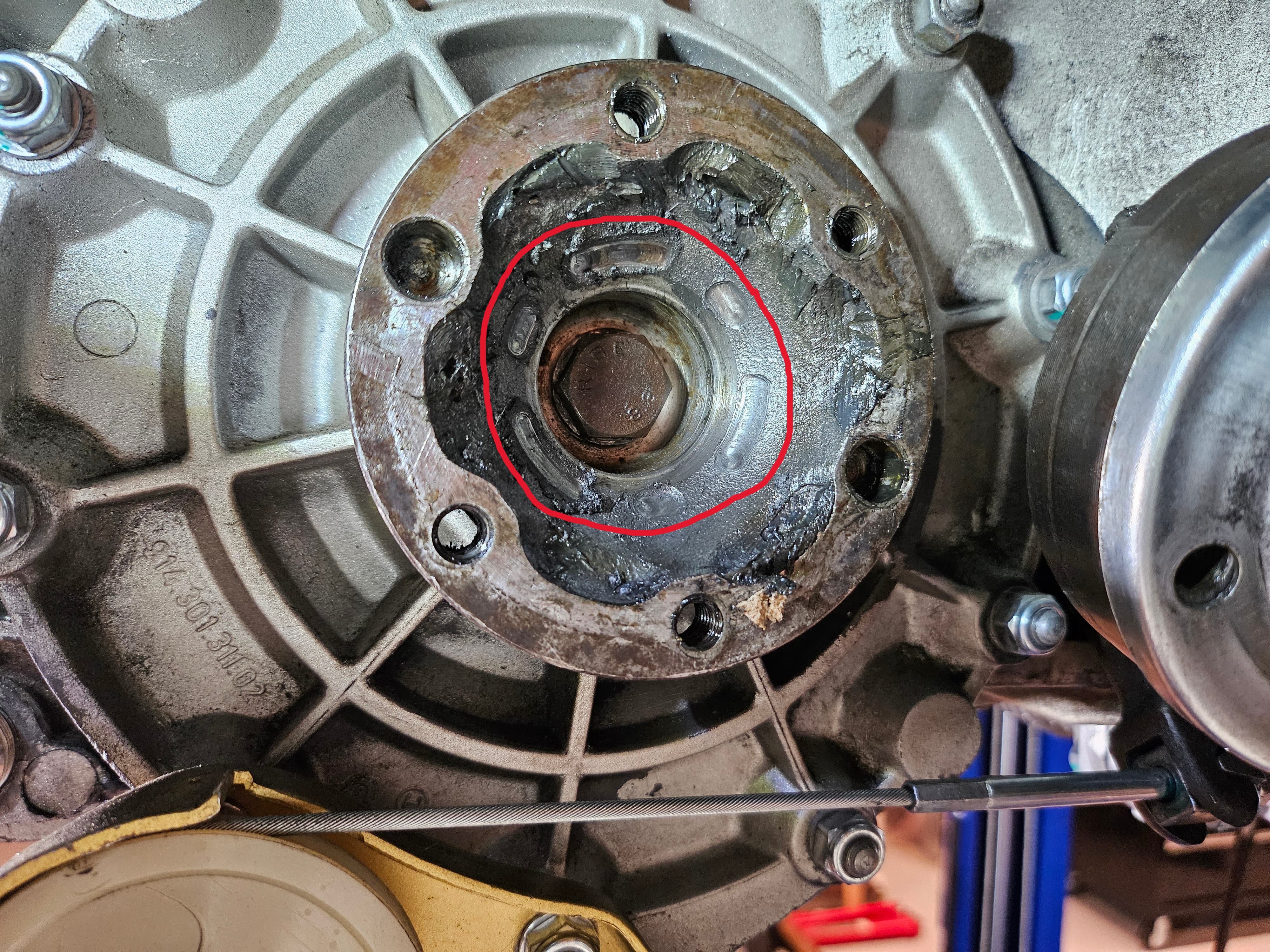 When I removed the inner CV joints from the transaxle flanges, I was surprised to see some pretty deep gouges in the flanges from the CV joint inner race/star (see photos below). This seems like a good candidate for the noise I am hearing. I have never seen this type of wear before with any of the other cars I've worked on - what would cause this? I noticed that there is not much grease in the joints, which I suppose is one possibility. Was the inner race put on backwards? Wrong parts? I did confirm that the axle shaft does move in and out freely at the outer CV joint. Thanks for any insight. Left flange: Right flange: Circled area shows where inner race is cutting into the flange. |