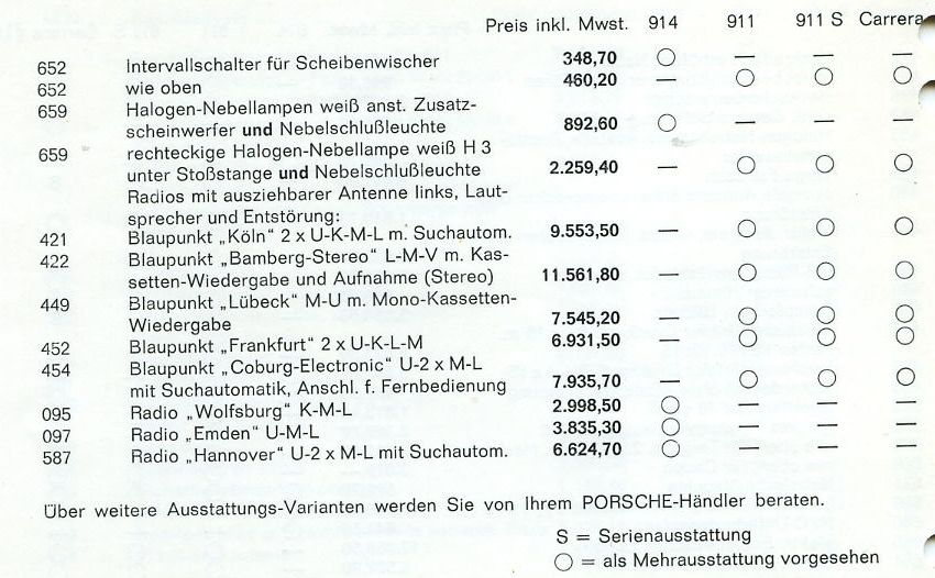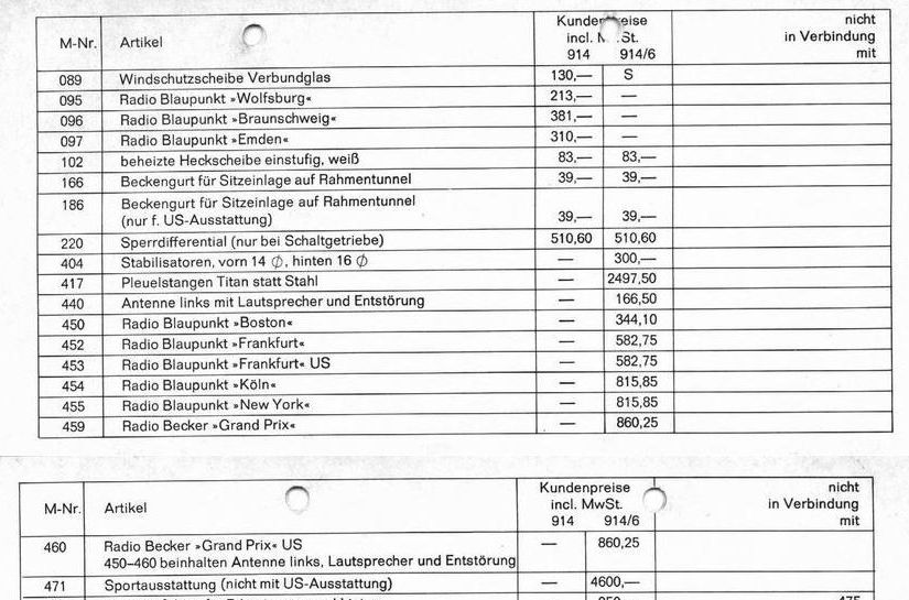 Wolfgang sent me several Euro price lists awhile ago. In order below, they are from 1971, 1973, 1974 & 1975. They all list radios as factory options, M-code items for both the 914/4 and 914/6. These lists are sales literature for Euro 914s only. Notice that the 914/6 had both Euro-version and USA-version radios available. Similar factory price lists for USA-market 914s are not available, that would clarify how USA 914s were treated. Is it possible that Euro 914/4s and 914/6s had factory-installed radios? There is alot of documentation showing that USA-market 914/6 radios were factory-equipment. Could it be a Stuttgart vs. Osnabruck thing?...Porsche provided radios from the factory (for both the USA and Euro market 914/6s) and Karmann only put radios in the Euro 914/4. Karmanns purpose was to bring the 914 to market at a lower price, and not including the the radios for USA market cars would achieve that. Besides most Americans would want to change the radio anyway. I checked all my 914/4 and 914/6 windshield stickers and COAs. Several of the 914/6 have radios listed, none of the 914/4 paperwork that looks legitimate have the radio. Attached thumbnail(s) Attached image(s)