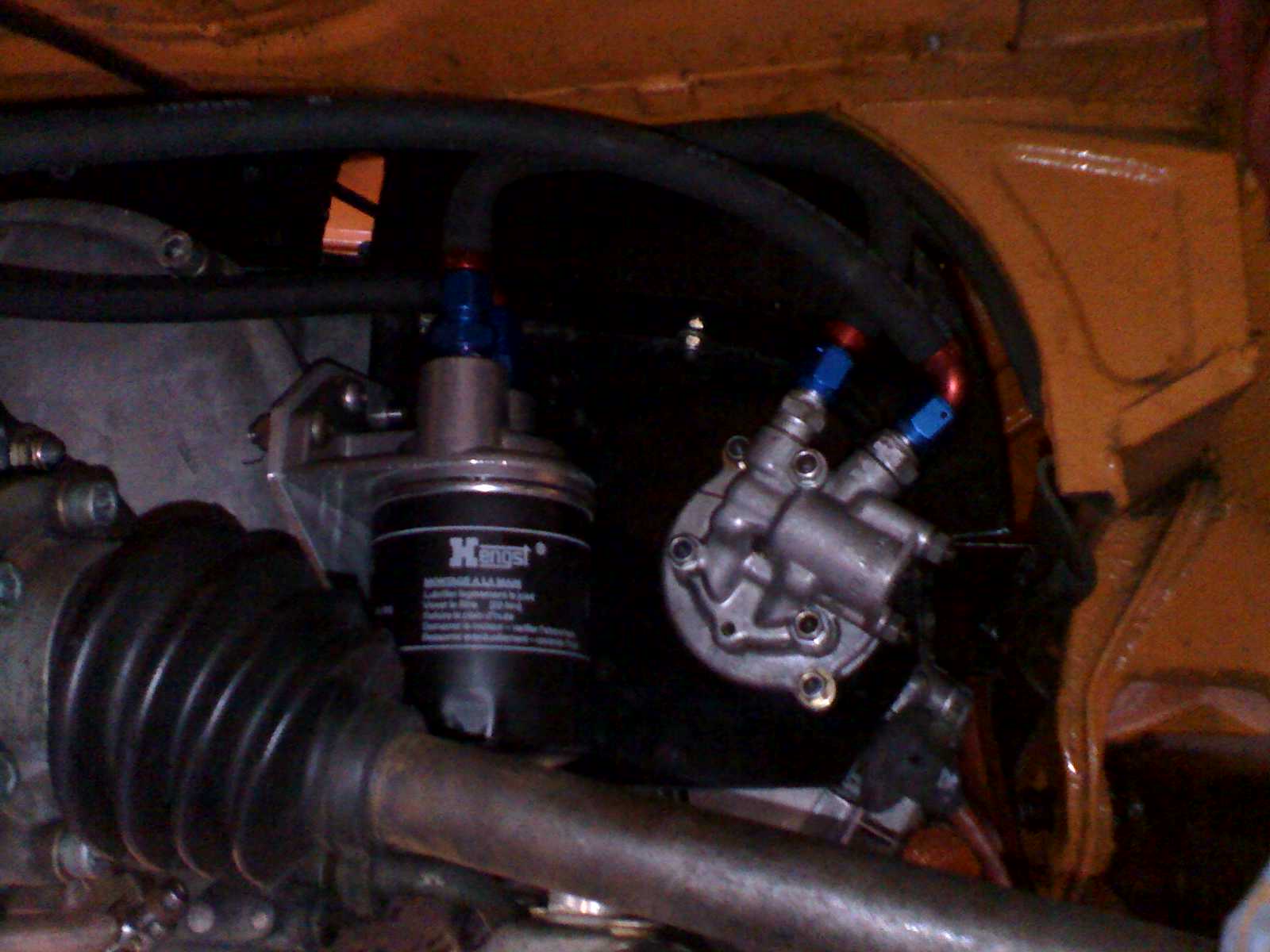 You should be able to find a sporto pump laying around without much trouble. Any porsche mechanic will have one laying under the bench somewhere. The pump is a small gear pump and should bolt straight up to the to the back of the cam. You take the pulley wheel off for the power steering belt and put the bolts back in, which drive drive the pump. Here's what Armando did. http://www.pbase.com/9146gt/image/54417634 Mine is pretty much the same. |