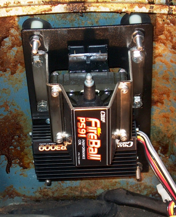 I made a plate, then painted it. The optical unit and the new coil mount to the plate, then it is mounted to the firewall with nylon standoffs and rubber isolation washers. Here's a picture (that's not rust, it's the glue from the engine bay pad).