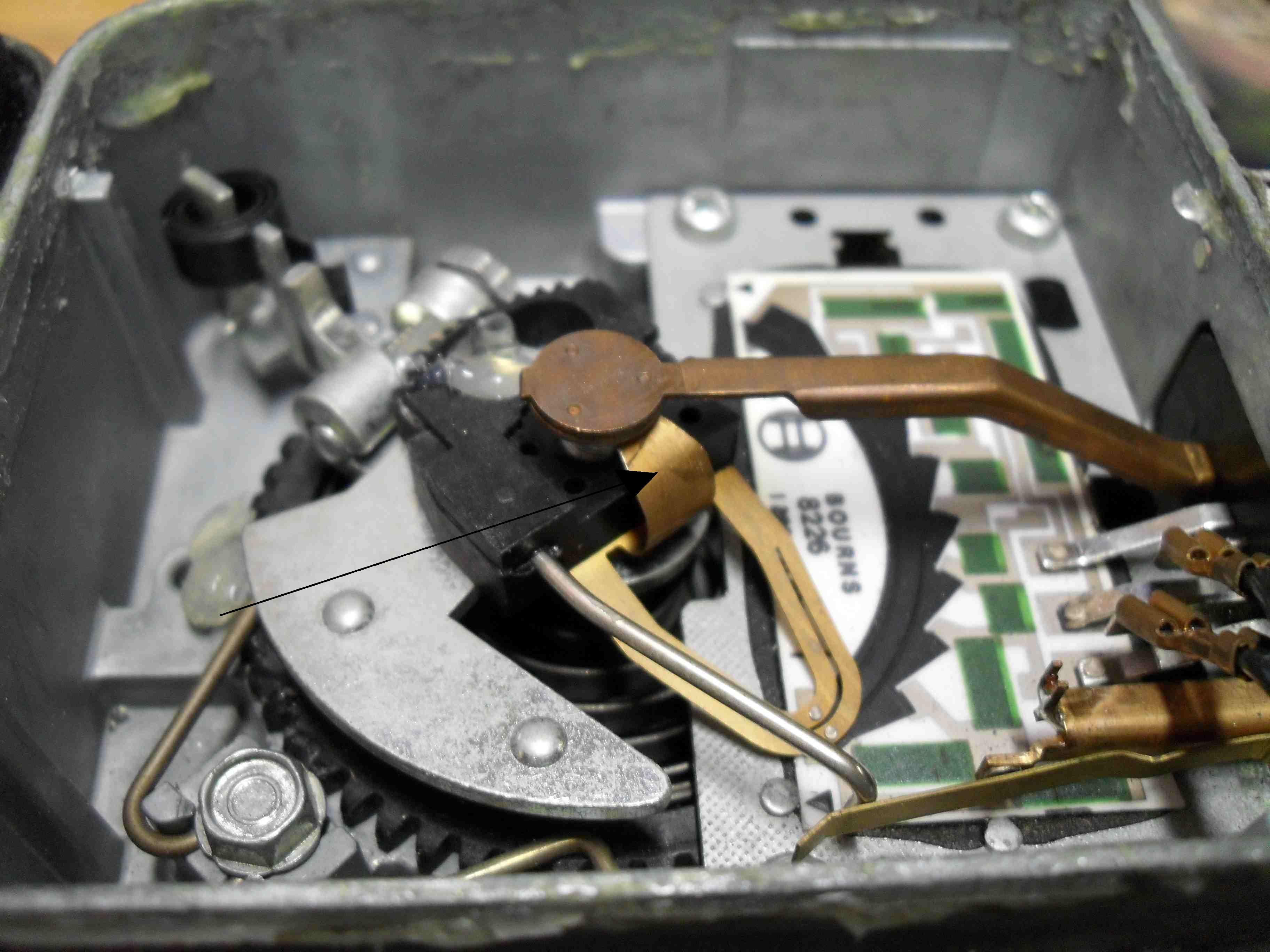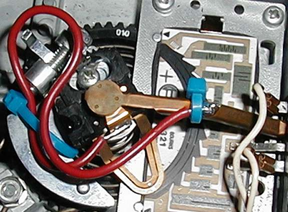 Great resource. I haven't seen that one before. I opened up my air flow sensor and discovered the problem. The center tab connection had somehow twisted to the side and was no longer making contact with the center pole. If you look closely you can see the arrow pointing to the copper tang. Nicely done. I had a problem with one of the other contacts. It was getting snagged on the rotor and would cause the engine to lose power under load. |