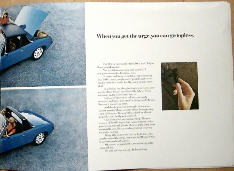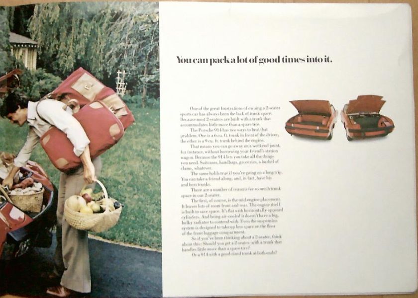 "The Race Porsche" is also "The Space Porsche" .... (IMG:style_emoticons/default/biggrin.gif) ![]() . . The latter ad above usually leads to "The Porsche Questions" which most of us with 914s in frequent use have heard more than once! "Hey - how many trunks does that thing have?" (IMG:style_emoticons/default/blink.gif) ... Ummm, well two! (IMG:style_emoticons/default/shades.gif) . . Which usually leads to: "Well how much can that little car hold?" (IMG:style_emoticons/default/confused24.gif) ![]() - This particular one usually popped up for me as we unloaded a 3-man dome tent, 2 sleeping bags, pads & cots, 2 ~ 12 qt. coolers, 2 beach chairs, Coleman stove & camp cook gear, lantern, several bags & backpacks, etc., etc. - while on a camp trip in my 73 914-2.0/"914 S" (IMG:style_emoticons/default/biggrin.gif) . . But those two invariably led to the infamous: "well then, where the heck is the engine in that thang!!??" (IMG:style_emoticons/default/unsure.gif) ![]() . . Which then usually requires further explanation of the differences between their cars, Bugs & 911s/912s & "Their Car" with the engine up front! ![]() . . Our 914's never cease to amaze the masses when they're seen in action - whether on the road, track or just pleasurable people & gear hauling for vacations or every day use! Porsche+Audi & VW-Porsche played these unique features & advantages up big time, as you can see from the period ads & sales brochure pages posted above. It's also endless giggles & entertainment for we Teeners! (IMG:style_emoticons/default/lol-2.gif) Hey jsr-jaime - how about you posting some of those cool 914 ads from Japan, that you posted over in the "Legend of the 914 S ...." topic???? (IMG:style_emoticons/default/confused24.gif) ... those were pretty cool! (IMG:style_emoticons/default/aktion035.gif) Anyone else with vintage 914 ads to post? (IMG:style_emoticons/default/shades.gif) (IMG:style_emoticons/default/popcorn[1].gif) (IMG:style_emoticons/default/popcorn[1].gif) (IMG:style_emoticons/default/popcorn[1].gif) (IMG:style_emoticons/default/popcorn[1].gif) |