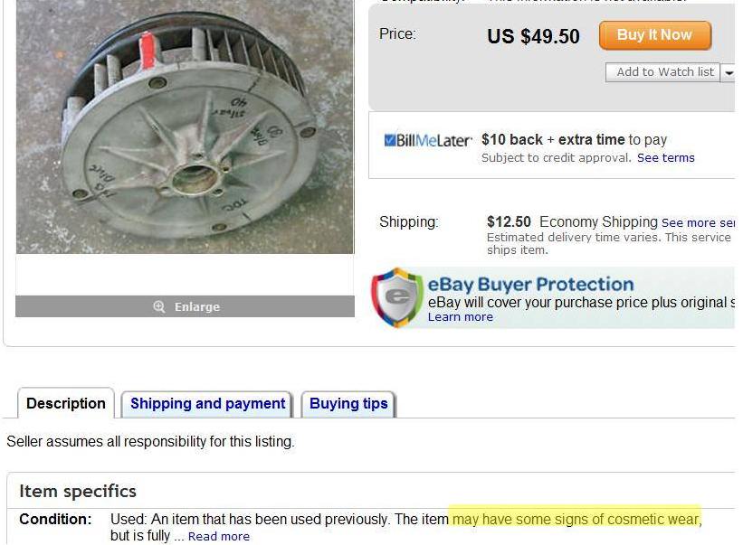 I emailed him he sent a good one free of charge. Maybe I misunderstood, Dave, but if you bought an item, then that item showed up missing a part meaning you had to contact the seller to get you the missing part, why do you feel like he sent you one "free of charge"? If " Bob " pays hooker " candy " for sex but hooker " Candy " only provides "Bob" a B.J. then " Bob " did not get what he paid for. Now then, if " Bob " complains, and " Candy " gives " Bob " sex then " Bob "gets a B.J. for free. Simple (IMG:style_emoticons/default/wacko.gif) |