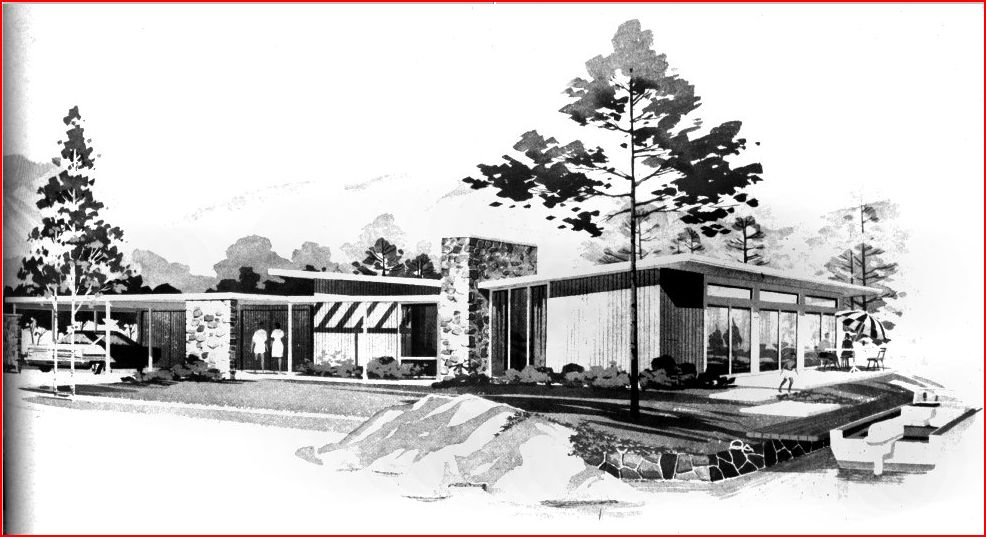Hi Rick, My wife and I stay at the Hideaway which is just down the street from and operated by the same people as the Orbit Inn (have an "Orbitini" for me). We'll be there in February during the Mid-Century Modern show. My wife and I are both big fans of mid-century architecture and design. Try to check out "Sinatra House" if you get a chance. We came close to buying a house in Palm Springs but it was 107 degrees when we looked. Kinda scared my wife off. (IMG:style_emoticons/default/biggrin.gif) Cheers, Elliot Ya, wish her meeting was next month. I met with a local architect last month about the plan for our house at the lake. I found this old sketch. We really like it. Our design won't be an exact copy but based on this design. Just need to win the lottery... (IMG:style_emoticons/default/dry.gif) Is that an Eichler design? |