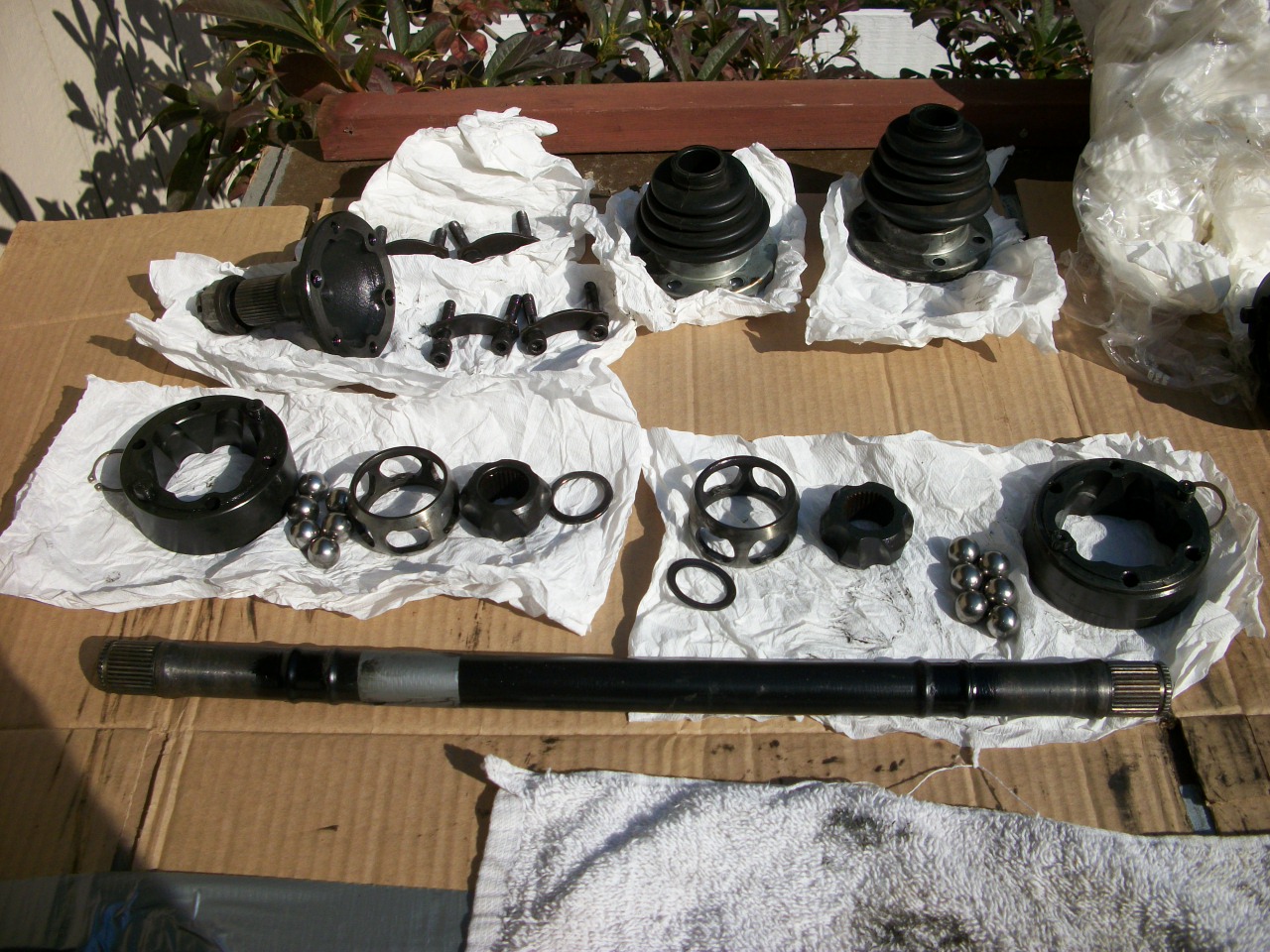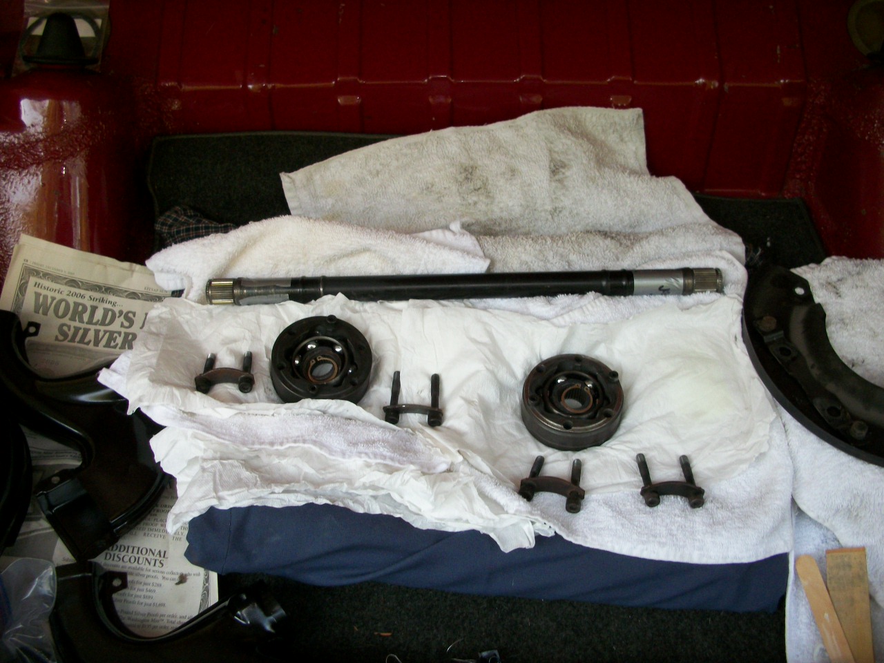 Well, things did not go as well as I was hoping. I thought the axles would go in with the trailing arm on. No! One must either have the trailing arm off or the exhaust system off. My exhaust doesn't leak, so I am going to leave it alone.