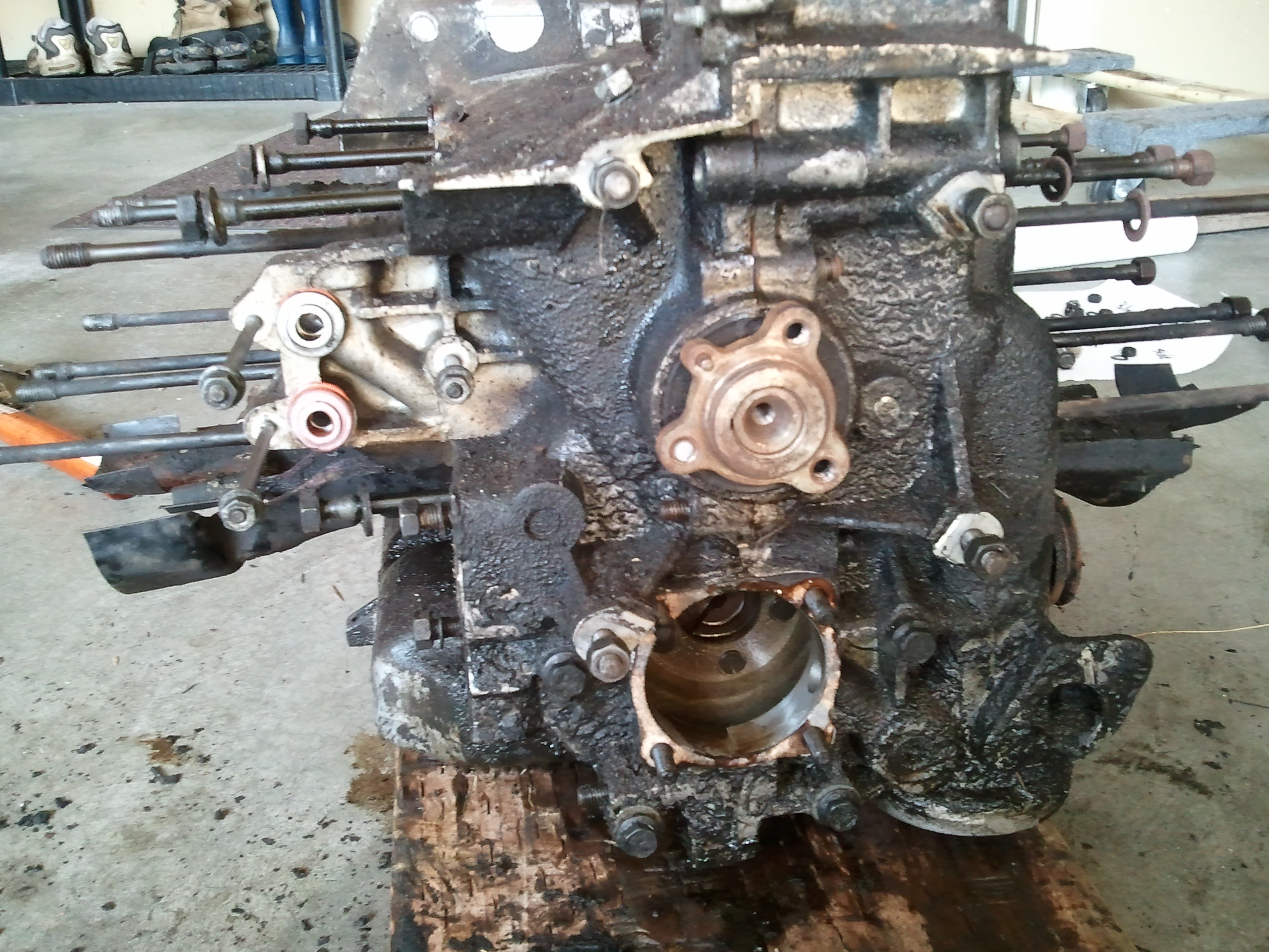 You can safely apply pressure by wedging a screwdriver between the crank and the front main seal. That way you have the hardened crank on one side and the rubber seal on the other and you can usually get it started there. It looks like you got all the nuts and bolts. But if it doesn't crack open with light pressure there, don't just push harder. Sometimes the sealant used on the case halves can make splitting a PITA. As mentioned... yeah, I've still got the hub on and its blocking me. you see, I broke one of the screws in it, so I'm kinda stuck with the hub on. |