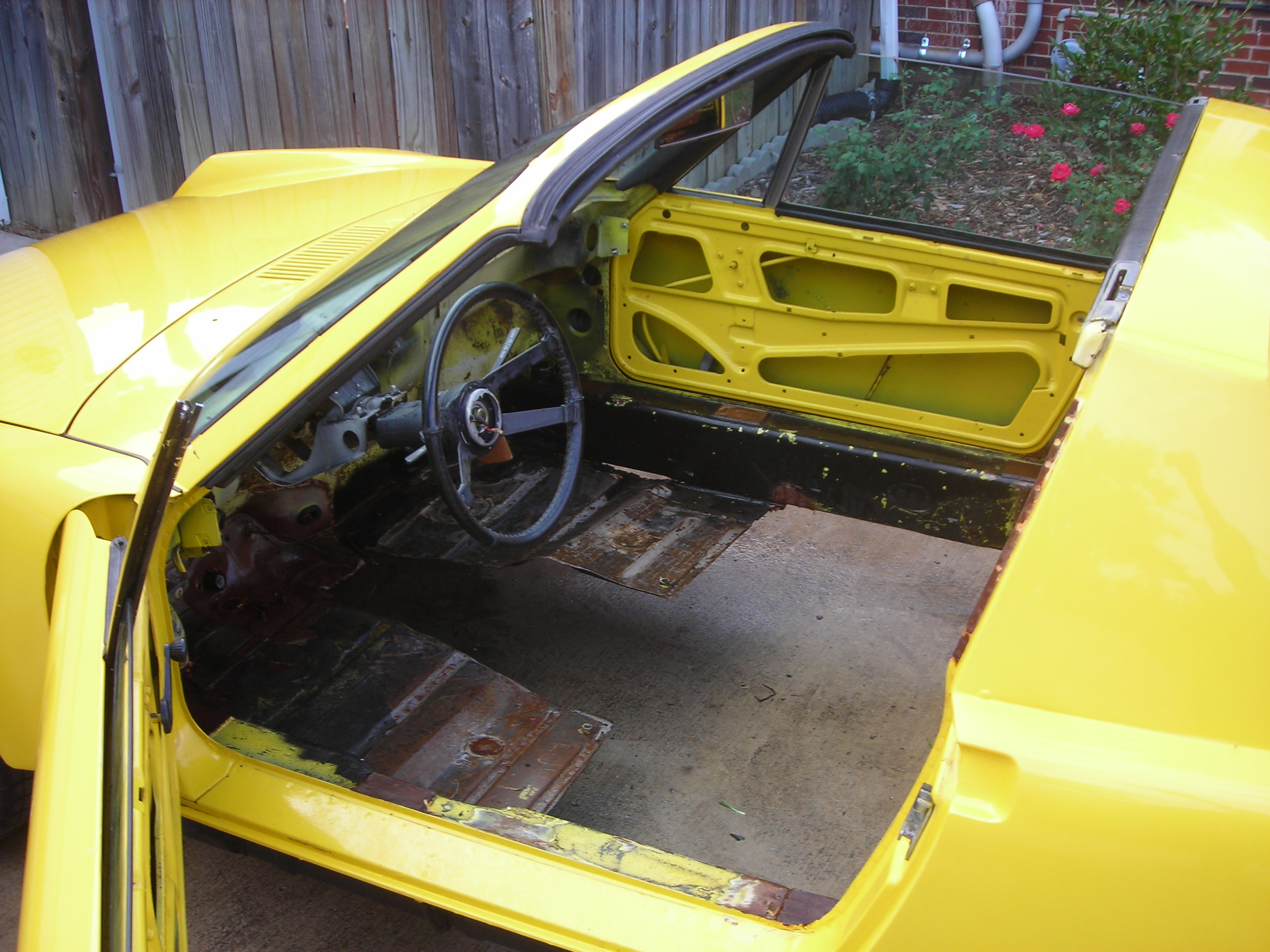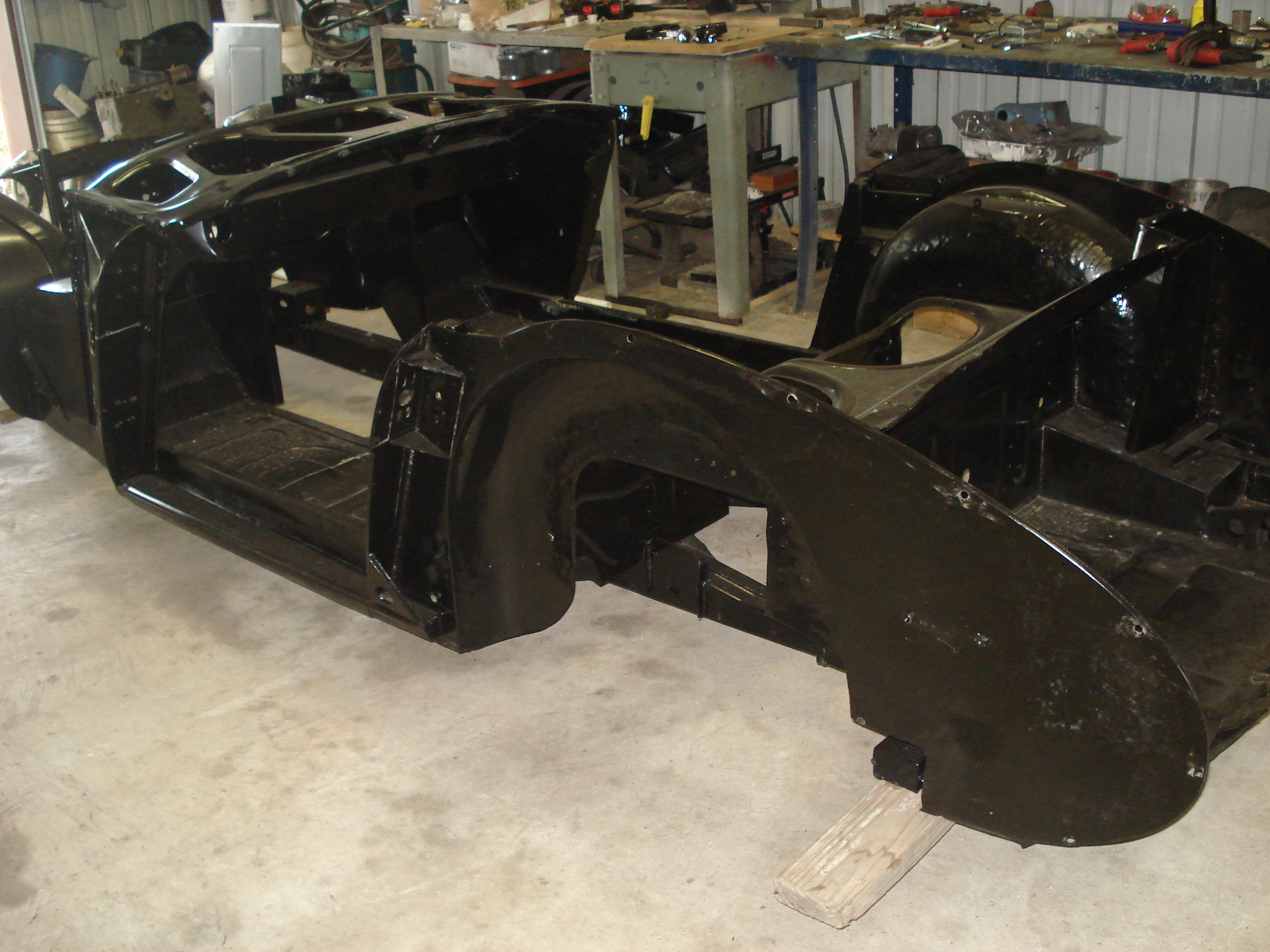 There is no rear floor pan section and no tunnel. I am probably going to build my own tunnel over replacement floor pans. I want a taller more narrow tunnel. I never liked how you are not centered on the wheels or pedals in a 914. SO I want to move the seats over closer to the middle of the car. Plus I want a taller center tunnel that will add more stiffness to the chassis. Another benefit is it gets the cable shifter up closer to the steering wheel. May even do a center tunnel mounted e-brake. |
