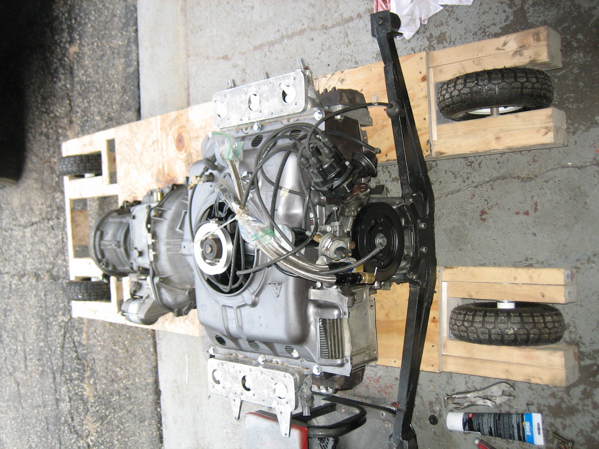 Meanwhile, I have the transmission and diff all reassembled and ready to mate up to the engine, I have the remove-install cart out and need to air up the tires, and I am making up the very simple wire harness. I had to get inventive today, too. The air lines are 3/4", 5/8" and 1/2". The 3/4 and 5/8 are connected directly to the plenum where they will experience maximum vac. I could not find any large vac hose locally and quickly, and the OE stuff is actually welded aluminum tubing with special ends that would not fit my setup. So, I bought some throttle pedal return springs in a package for $2.49, took the one about the right dia and stretched it out. I cut it to length and slid it into the hose. No way that they will collapse now (IMG:style_emoticons/default/smile.gif) More tomorrow. |