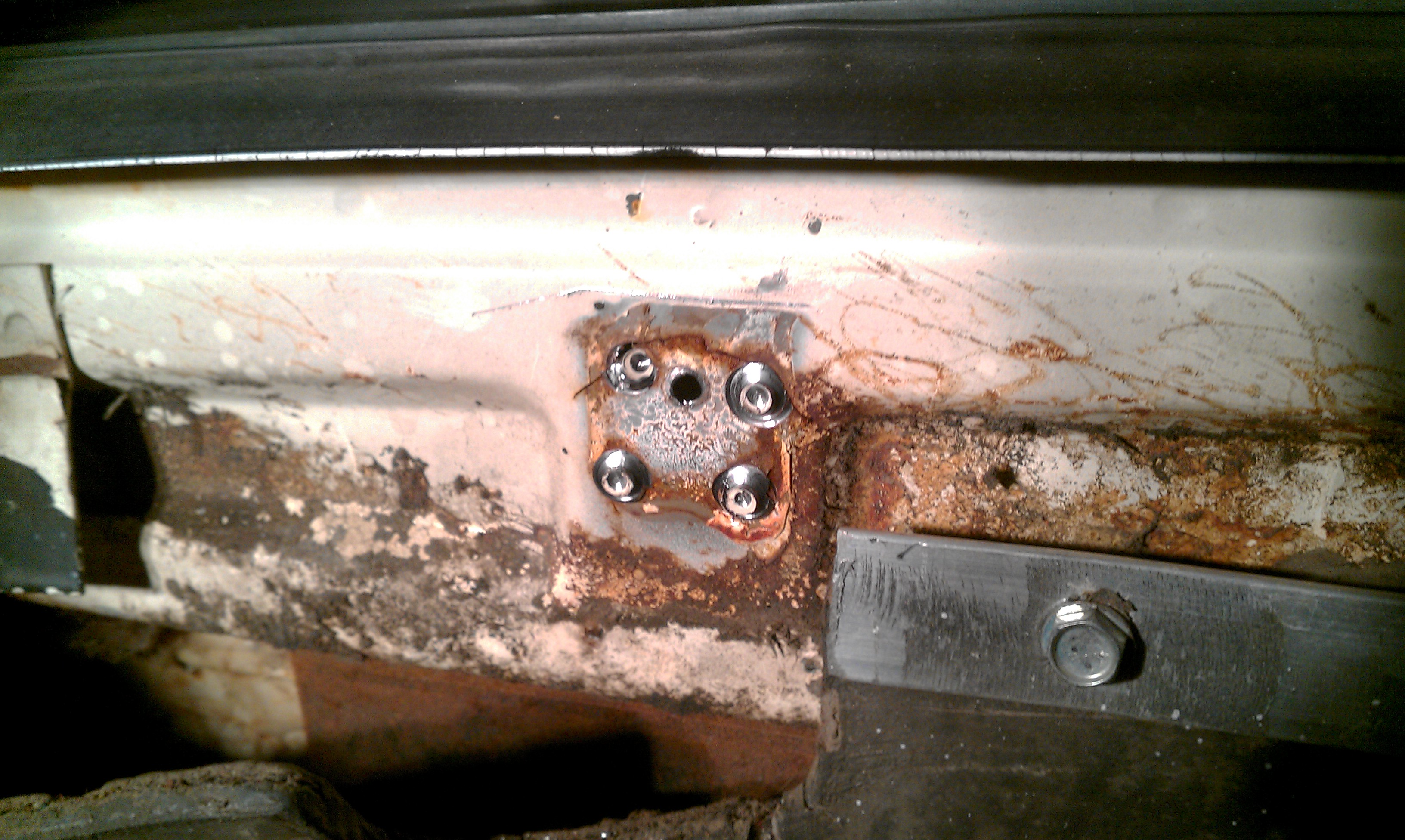 Decided to tackle my problem with the engine lid hinge on my other car. Late last summer I found the hinge was coming away from the body. Hinge wasn't cracked. Spot welds were still intact. The damn firewall had cracked. Right above the top spot welds. (IMG:style_emoticons/default/sad.gif) (IMG:style_emoticons/default/sad.gif) |