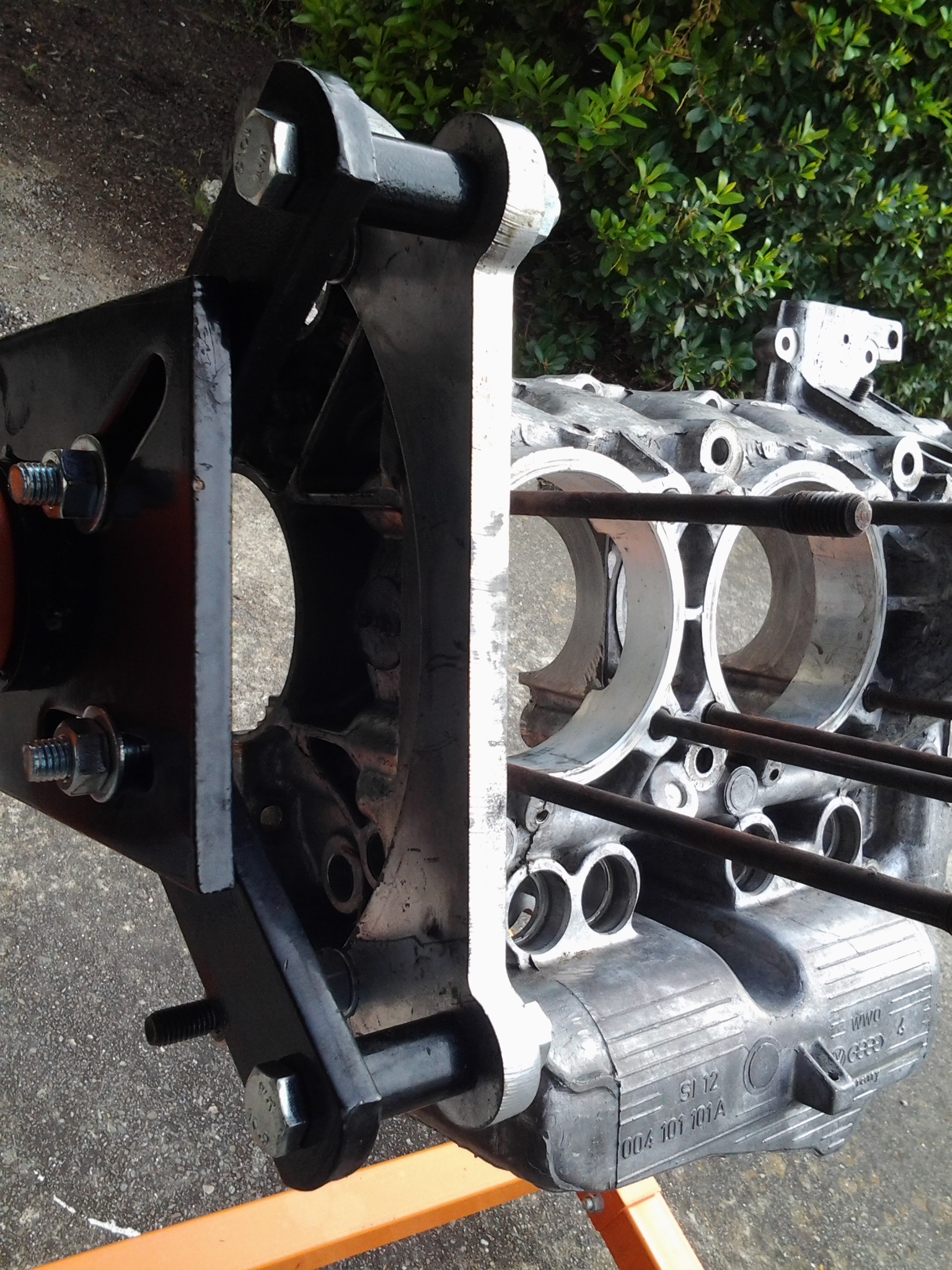 Any way you go, make sure that the engine stands on the circular lip around the flywheel housing. The 2 arm stands that only hold the engine from the bolt holes are prone to fail and concentrate all the force in a single small location. I've seen a lighter bug engine case broken by the stand when one of the arms collapsed and the other broke the engine case hole that was connected to. |