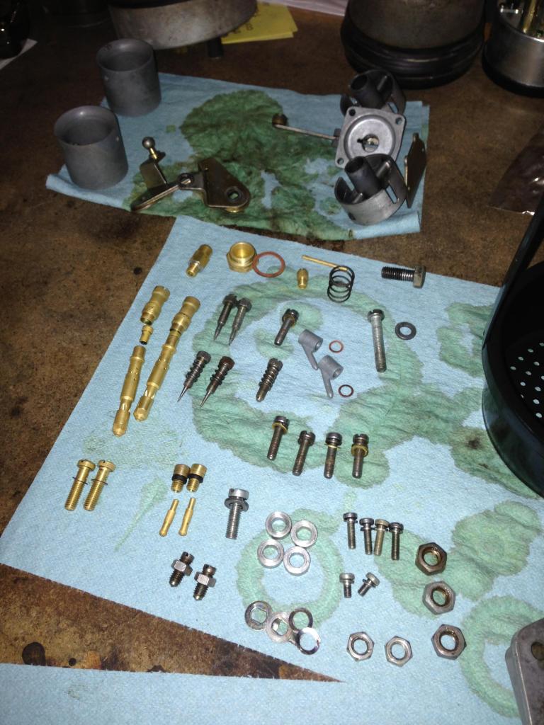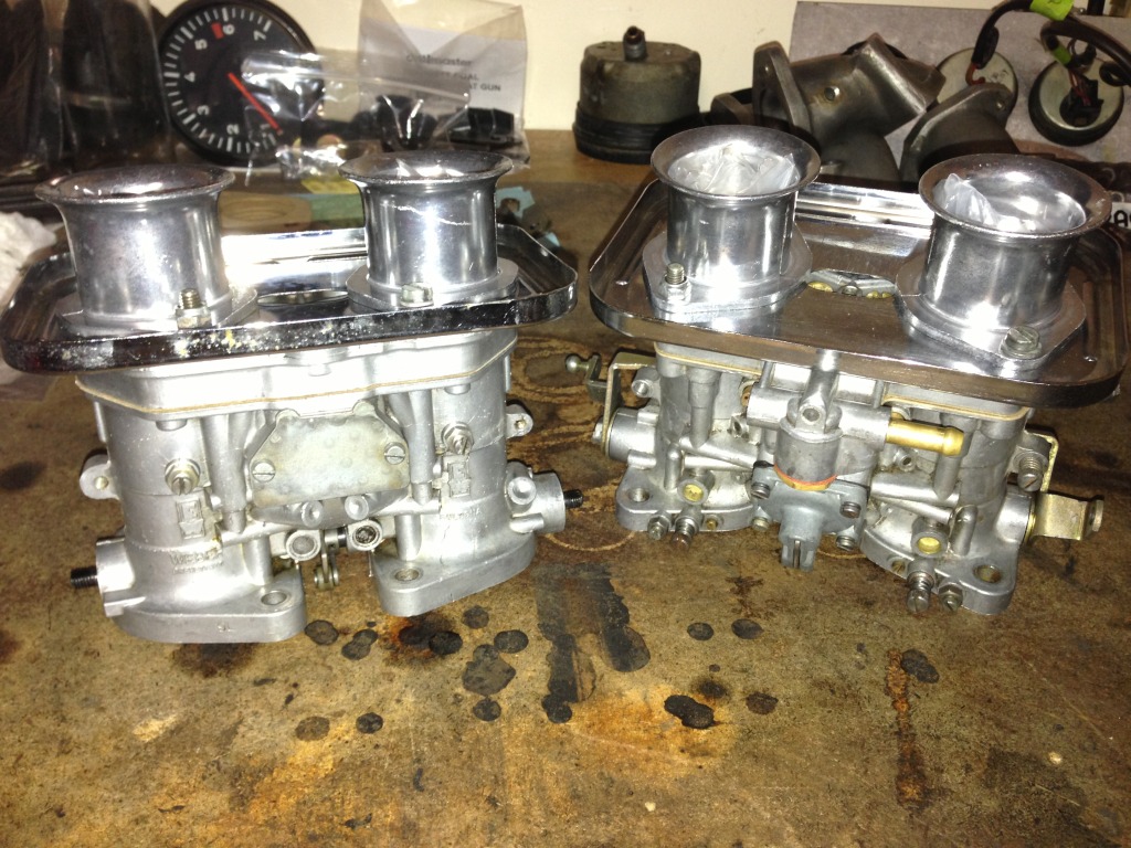 Finals are finished!! So I will have a week to crank out work on the Porsche! I started Thursday night taking apart the carbs and cleaning them in carb dip, checking all the individual parts for damage. Of all the parts only one idle jet needs replacing, the hole is slightly twisted. I am trying to do a bunch of research on what sizing to go with, Doug and Ethan are helping me out a lot with that too! Currently have 30 venturies, 115 main jet, 50 idle, and an f11 emulsion tube (dual 40 webers) don't remember what the air vents are at... Any suggestions will be accepted!!