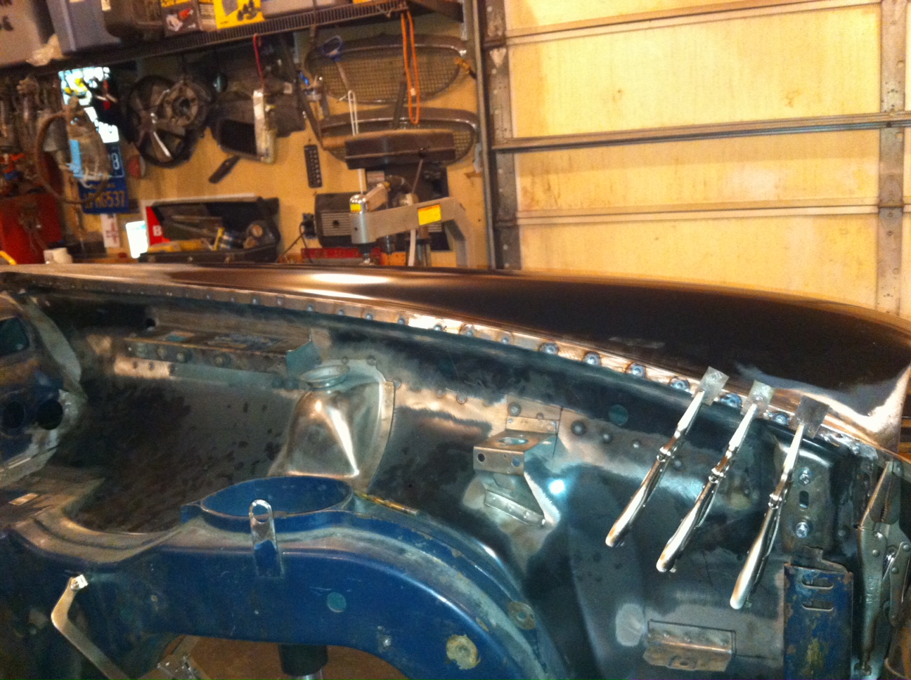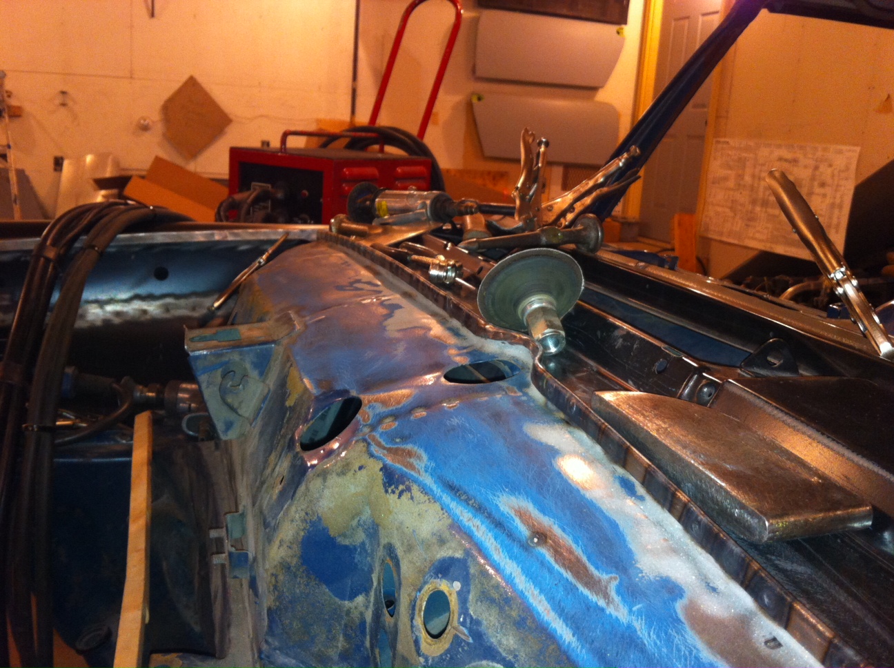 Drug out all the welders for this one. The cowl top panel has a flange that is hammered over like a door skin then spot welded. Then lots of spot welds all around the shroud. (IMG:style_emoticons/default/welder.gif) |