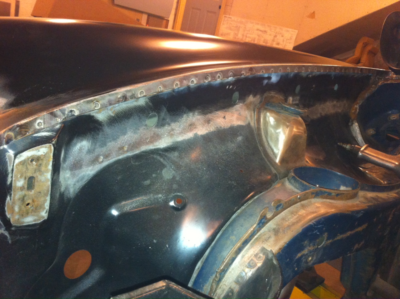 This is the under side of the fender to cowl seam with the back up strip in place. |