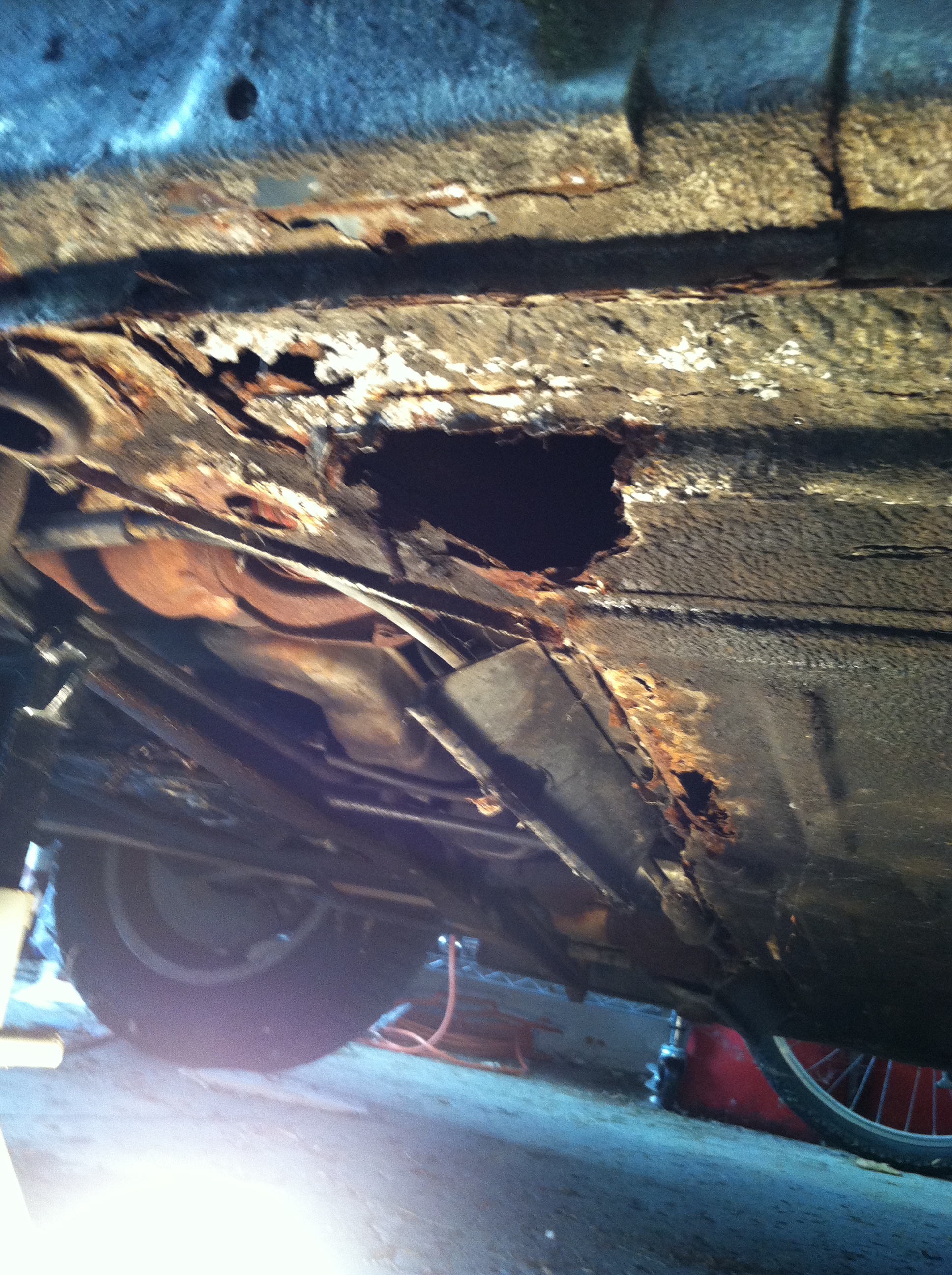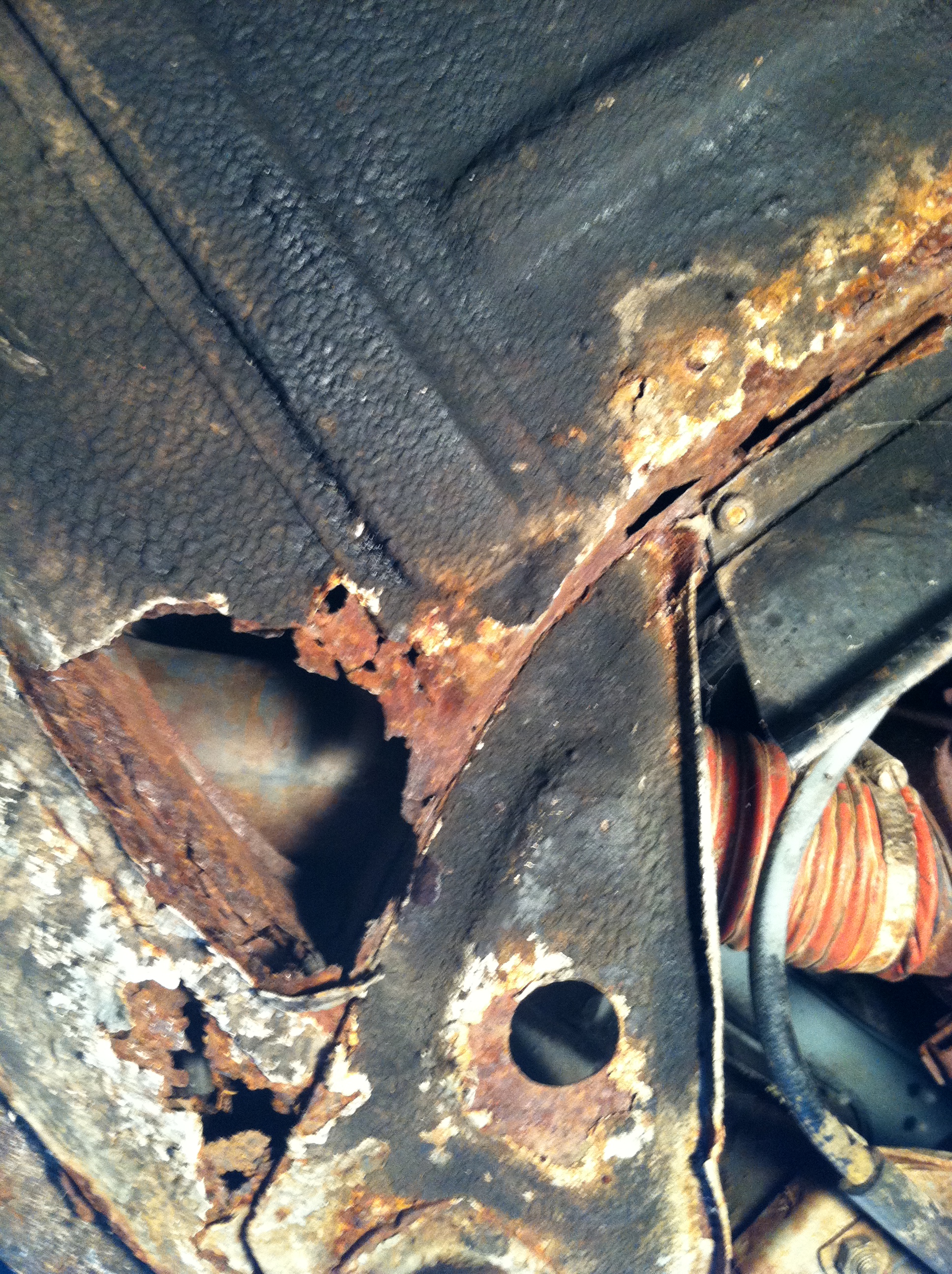 I agree and don't go under that car. pls give us pics of the entire car when you have some time. though it is looking more and more like you need a rust free roller to move your parts over to. then you'll find you need suspension and brake parts. Here are a few more of the area in and around the HH. Attached thumbnail(s) |