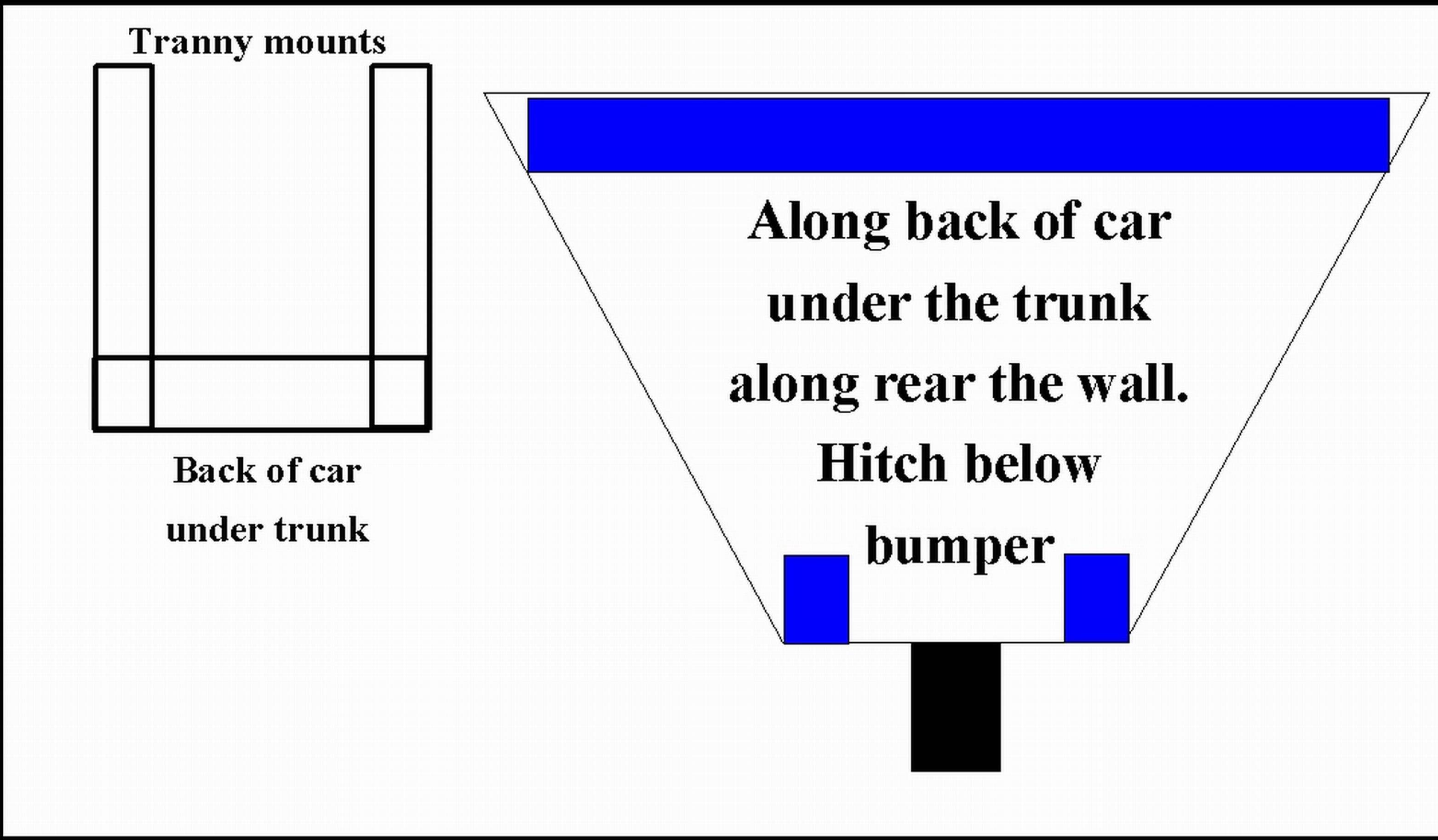 Yeah Gerold I did that with my v8 car in the pics. Works great but I'm not about to mess with my paint. I think I could get by with using the tranny mounts. Have a bar coming off the plate from those to the rear wall where they meet a plate the hitch is on. That plate would have 2 nice bolts going through the body. Then for a little more structure a piece coming back to bolt to my drivetrain cradle. It is stout & would help make this a pretty rigid setup (IMG:style_emoticons/default/idea.gif) . Not unlike yours Stephen. Might even be able to retrofit yours. I don't have the stock muffler setup to worry about getting in the way so that is nice