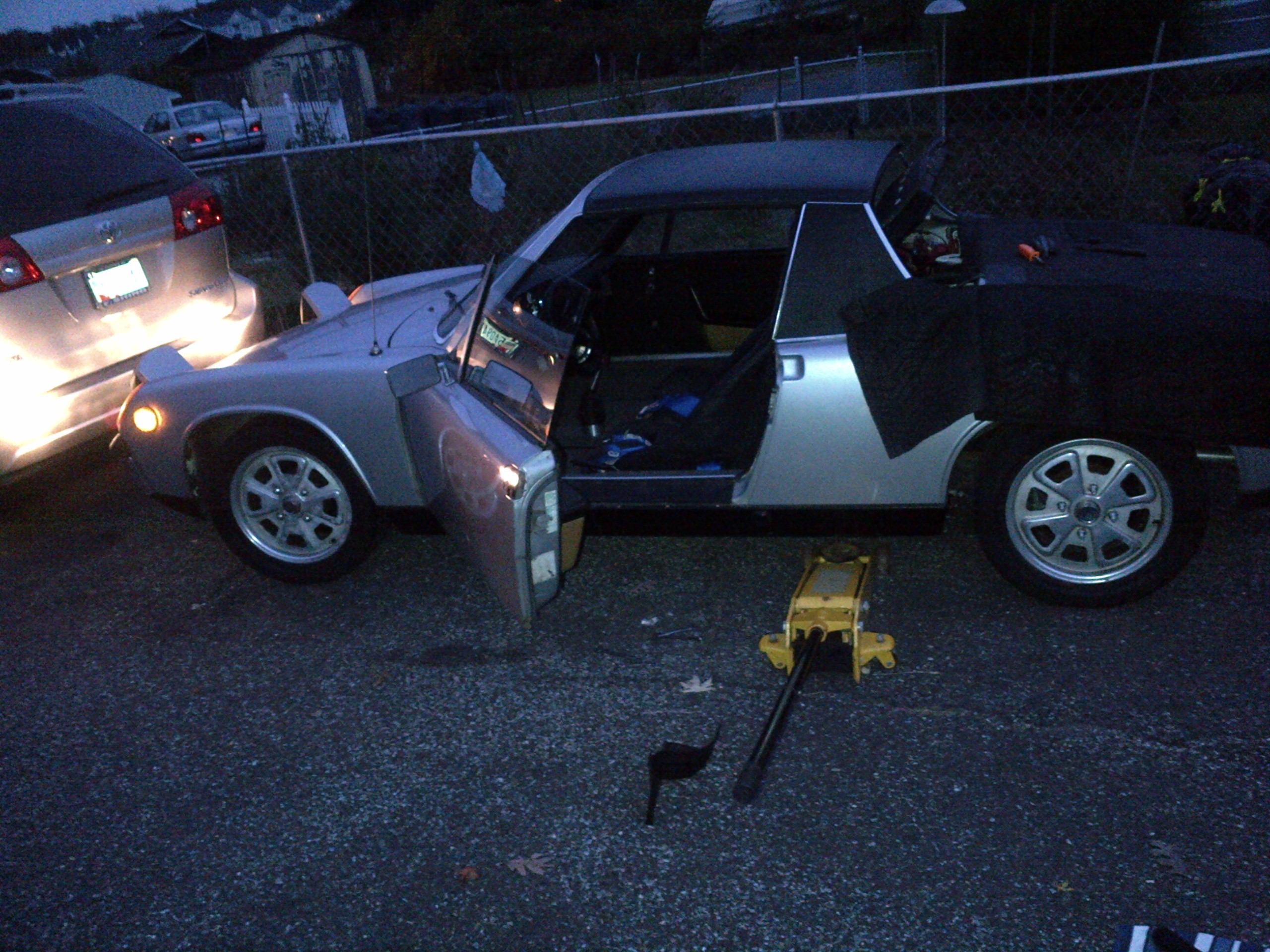I have gotten some of the heater tins I need and have recieved some hoses from 914rubber and ordered the HE and modified parts from Tangerine. Attached are some pics of the car, the first night I got it the alternator belt kicked and had fun putting it back on. (IMG:style_emoticons/default/rolleyes.gif) |