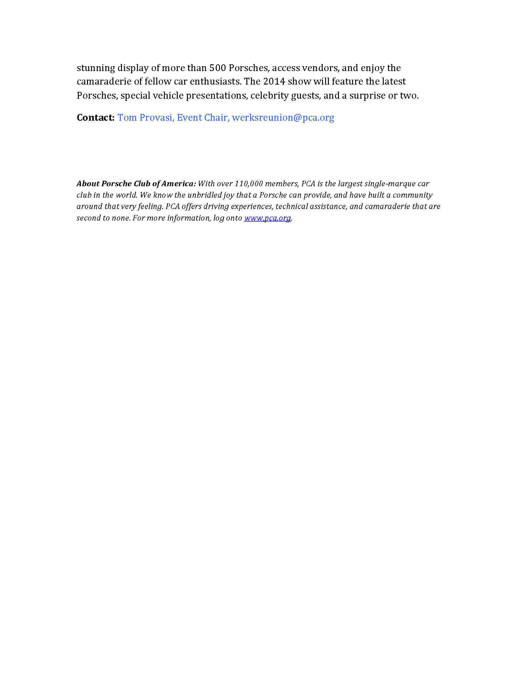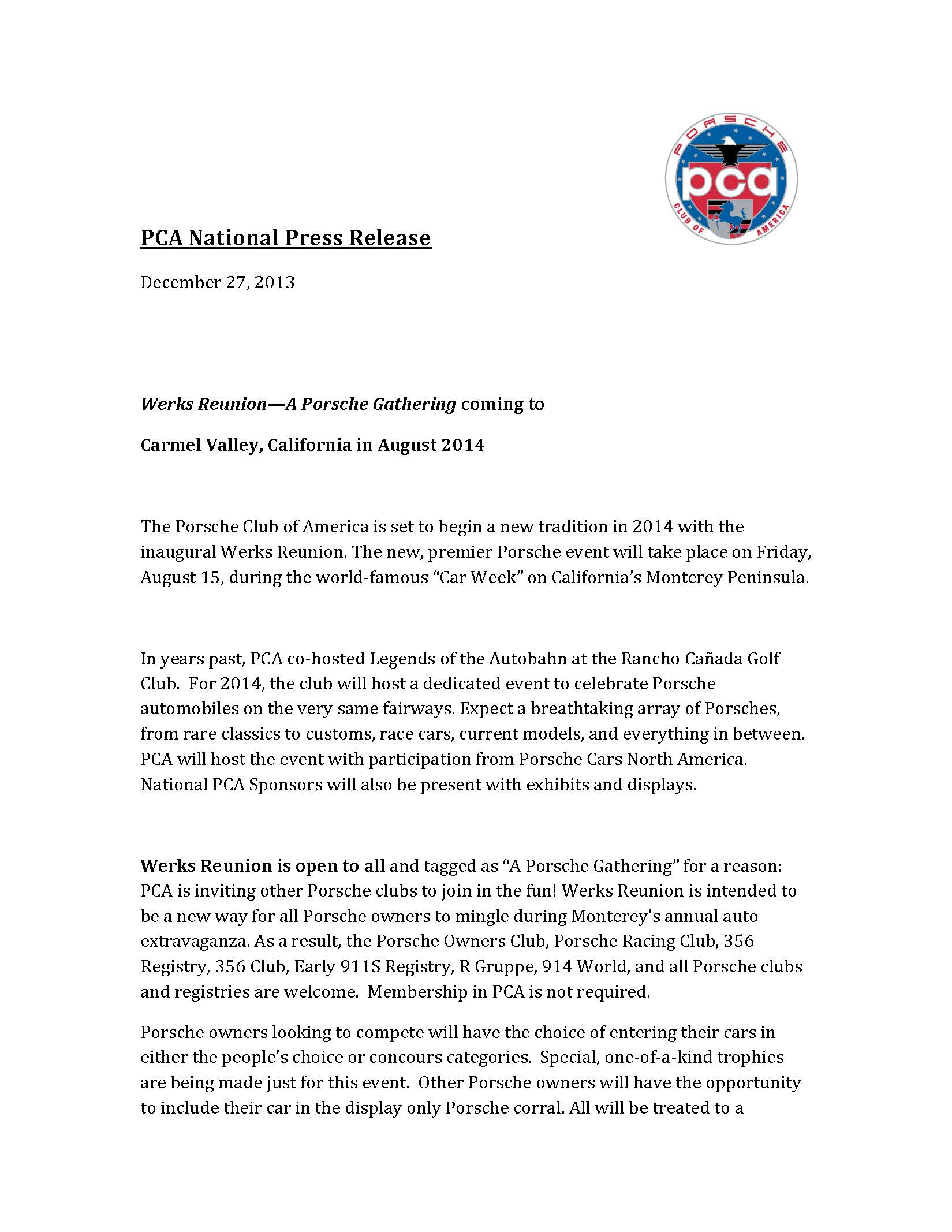 PCA National Press Release December 27, 2013 Werks Reunion—A Porsche Gathering coming to Carmel Valley, California in August 2014 The Porsche Club of America is set to begin a new tradition in 2014 with the inaugural Werks Reunion. The new, premier Porsche event will take place on Friday, August 15, during the world-famous “Car Week” on California’s Monterey Peninsula. In years past, PCA co-hosted Legends of the Autobahn at the Rancho Cañada Golf Club. For 2014, the club will host a dedicated event to celebrate Porsche automobiles on the very same fairways. Expect a breathtaking array of Porsches, from rare classics to customs, race cars, current models, and everything in between. PCA will host the event with participation from Porsche Cars North America. National PCA Sponsors will also be present with exhibits and displays. Werks Reunion is open to all and tagged as “A Porsche Gathering” for a reason: PCA is inviting other Porsche clubs to join in the fun! Werks Reunion is intended to be a new way for all Porsche owners to mingle during Monterey’s annual auto extravaganza. As a result, the Porsche Owners Club, Porsche Racing Club, 356 Registry, 356 Club, Early 911S Registry, R Gruppe, 914 World, and all Porsche clubs and registries are welcome. Membership in PCA is not required. Porsche owners looking to compete will have the choice of entering their cars in either the people's choice or concours categories. Special, one-of-a-kind trophies are being made just for this event. Other Porsche owners will have the opportunity to include their car in the display only Porsche corral. All will be treated to a stunning display of more than 500 Porsches, access vendors, and enjoy the camaraderie of fellow car enthusiasts. The 2014 show will feature the latest Porsches, special vehicle presentations, celebrity guests, and a surprise or two. Contact: Tom Provasi, Event Chair, werksreunion@pca.org About Porsche Club of America: With over 110,000 members, PCA is the largest single-marque car club in the world. We know the unbridled joy that a Porsche can provide, and have built a community around that very feeling. PCA offers driving experiences, technical assistance, and camaraderie that are second to none. For more information, log onto www.pca.org. PDF download of this release: Attachment:WerksreunionPressreleasefinal.pdf This email was sent by Vu Nguyen and the National Porsche Club of America, Inc. © Copyright 2013 Porsche Club of America Inc. All rights reserved. You may opt-out of receiving emails from PCA National by updating your PCA membership record at our web site. Read the PCA privacy policy. |