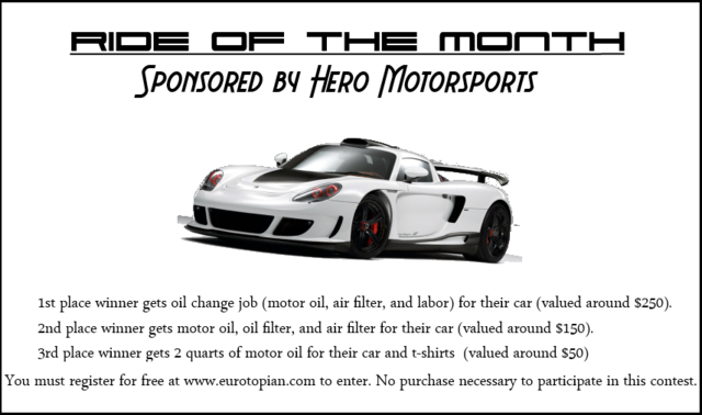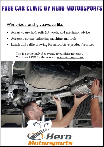 - May 23rd, the ROTM (Ride Of The Month) contest is free to enter. - May 24th, there will be limited spots for a free car lift/corner balancing day. You will find all the information below for both: The top three popular cars by vote will receive prizes from Hero Motorsports and they are as follows: - 1st place winner gets oil change job (motor oil, air filter, and labor) for their car (valued around $250 depending on car make/model). - 2nd place winner gets motor oil, oil filter, and air filter for their car (valued around $150 depending on car make/model). - 3rd place winner gets 2 quarts of motor oil for their car and Hero Motorsports & Eurotopia t-shirts (valued around $50) To qualify please register for free here: http://eurotopian.com/thread/700/ride-mont...red-motorsports ~~~~~~~~~~~~~~~~~~~~~~~~~~~~~~~~~~~~~~~~~~~~~~~~~~~~~~~~~~~~~~~~ Our sponsor Hero Motorsports (25 years in European car service) has done it again! 996tt has stepped forward to host an event on May 24th, Saturday, at their Van Nuys location. They will be offering one free raffle per car for a chance to win multiple FREE* car clinic sessions in their 13,000 square foot facility. If you are looking to work on your car (supervised by their mechanic) or corner balancing your car including a complimentary lunch and free giveaways then this event is for you! To RSVP please register for free here:: http://eurotopian.com/thread/699/free-clin...h-24th-saturday |