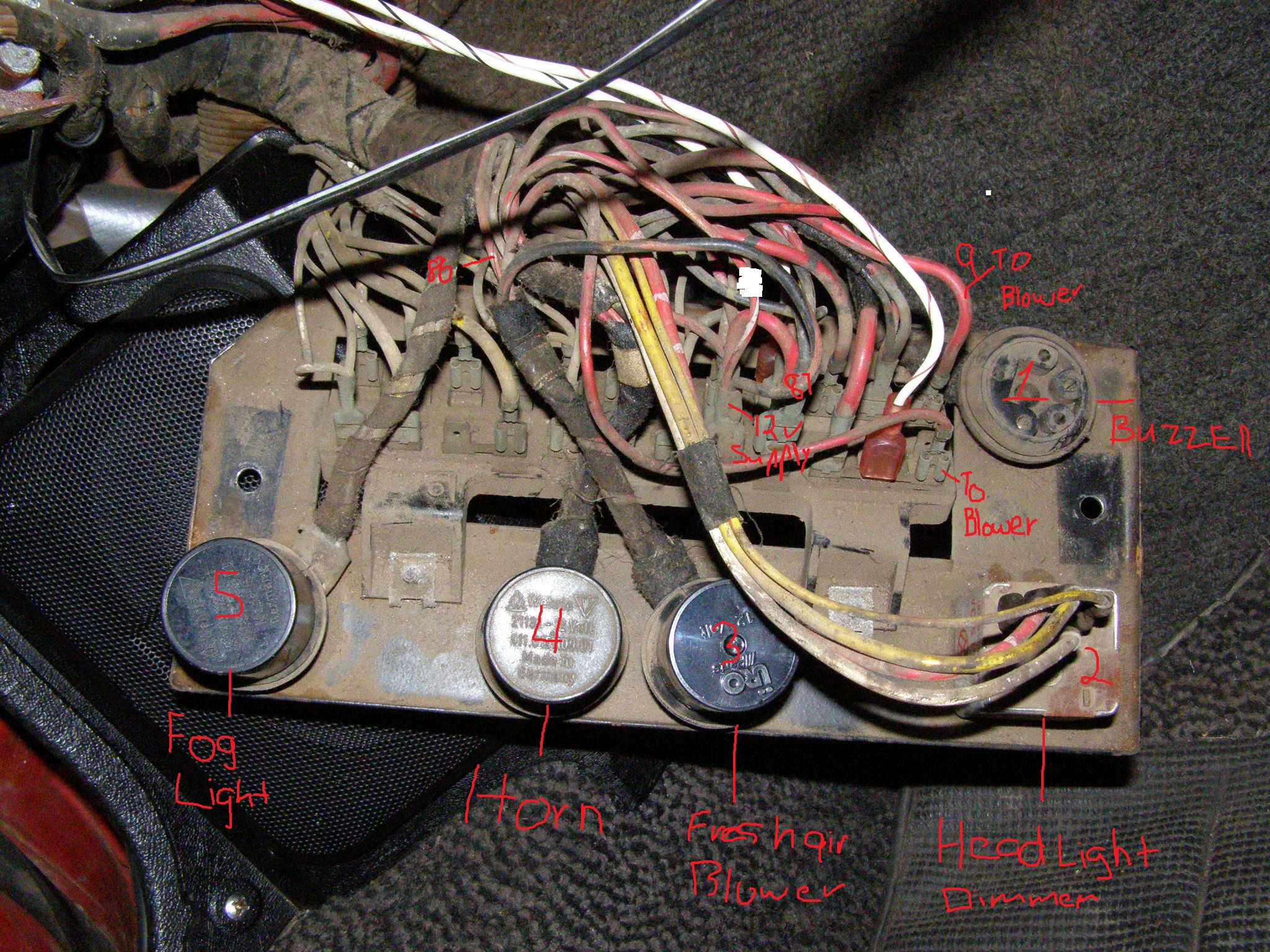 Well I made some progress but no sucess in getting the thing to work. I cleaned the contacts and confirmed they have good grounds. I also picked up a bulb and got the blue blower indicator light on the right side of the panel working it comes on when you slide the lever. I still can't find the wire or bulb holder for the red light on the left side of the panel. I pulled the panel out as far as I could and also took the instrument panel and gauges loose so I could look behind them for any wayward wire but found nothing. The wiring diagram for my 72 shows item 54 as a relay for fresh air fan, can anyone tell where it's located?