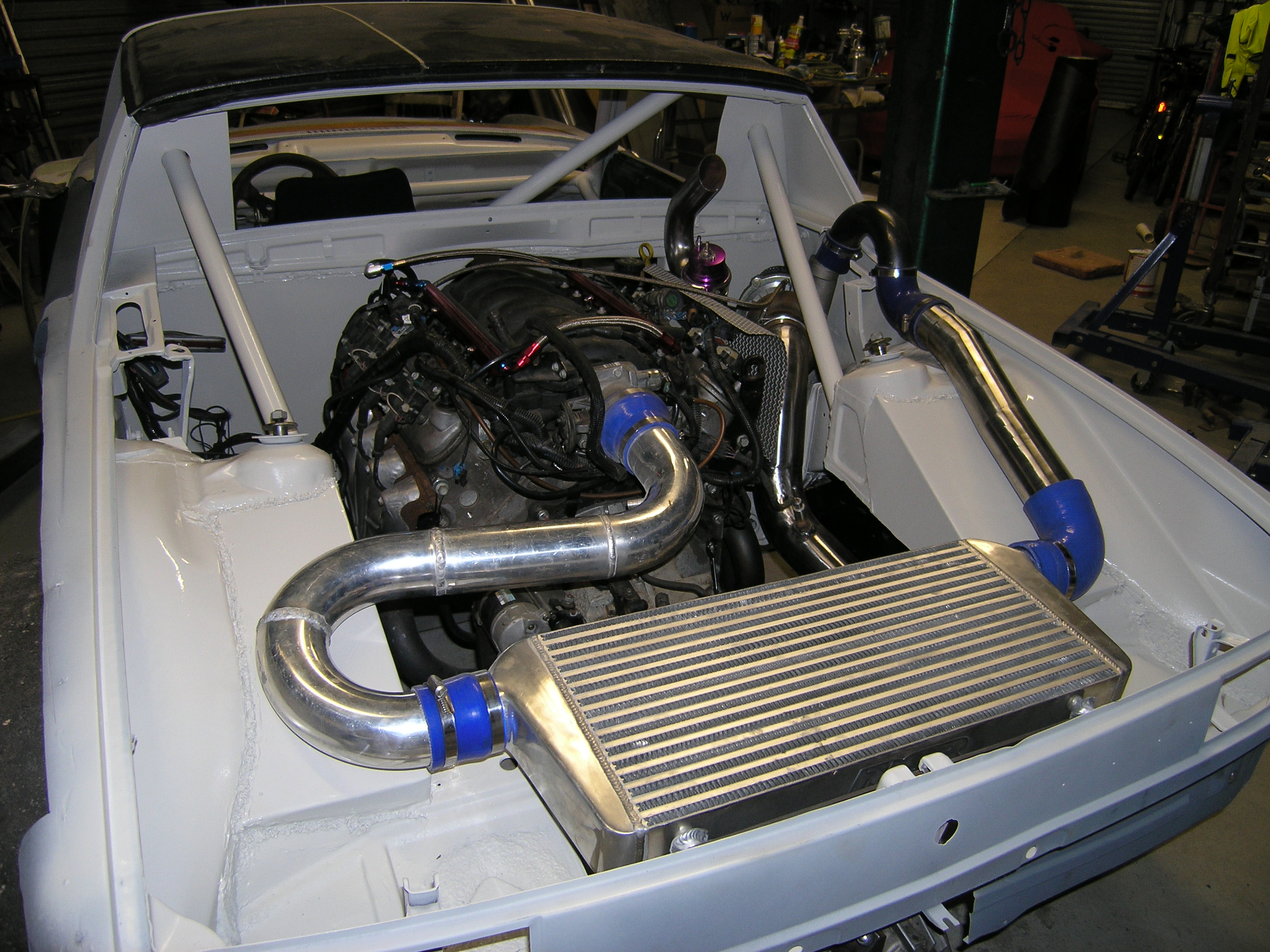OK. the car is widebody, but will now be slightly narrower at the front after yesterdays modification.It runs a turbocharged LS1 /subaru 6 speed combo. 18x10.5 rears and 18x9.5 front with slicks