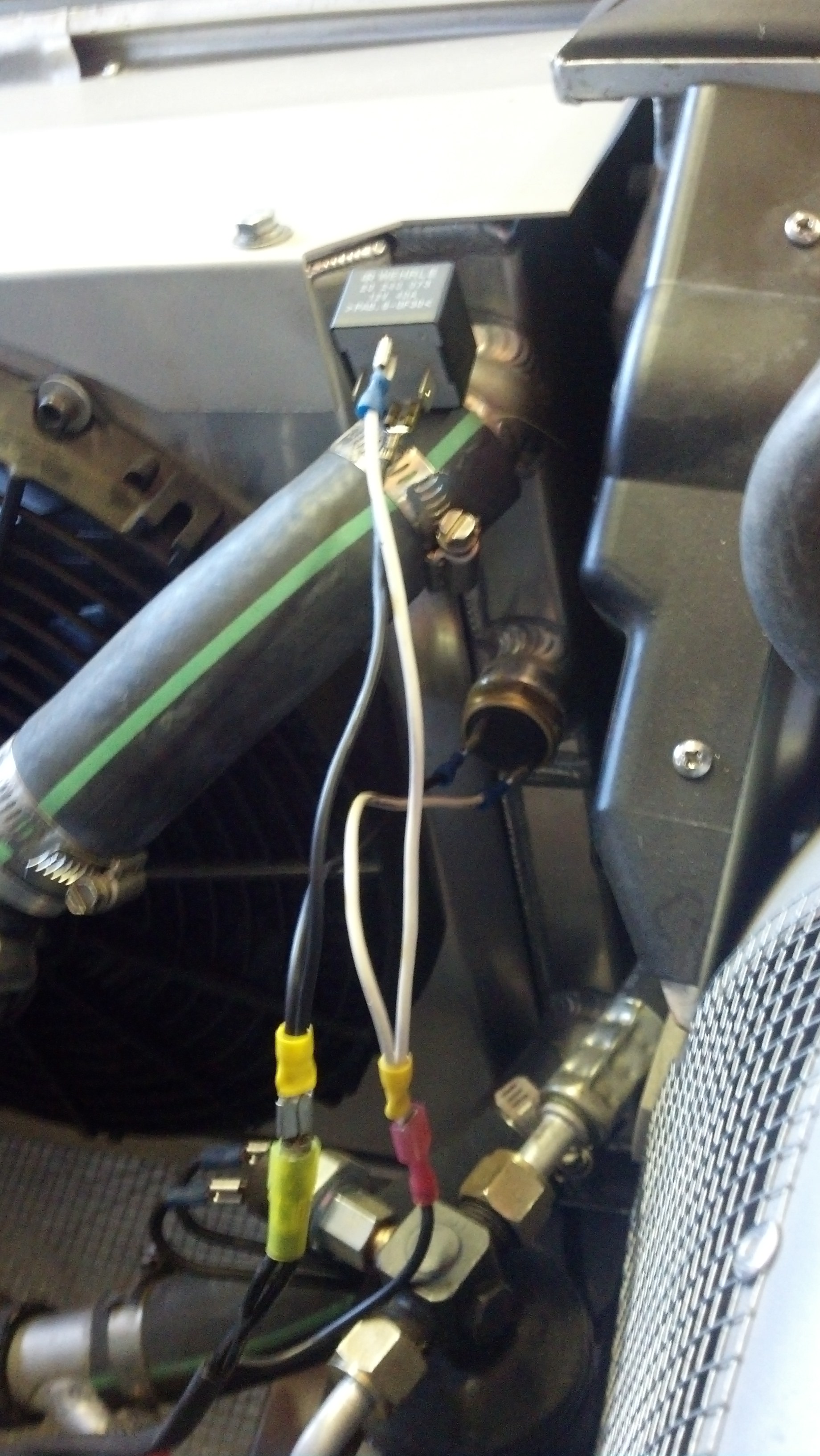 This is a Renegade 914 with a small block chevy. Aluminum radiator with dual fans up front that automatically engages with a temp sensor. There are two relays on the fan shroud but when the temp sensor kicks, both fans come on.