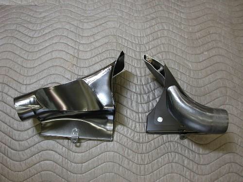 Paul No need for J pipes on a 6 Engine cooling fan side tubes down through the engine side tin and into the heat exchangers. Hot air out of exchangers through flapper valves and into longs. 4 cyl. flappers can attach right onto the exchangers. How the control wires and the direction of the arms on the flappers will work I can't tell you. The only heater/ blower fan on a 6 is in the dashboard. |
