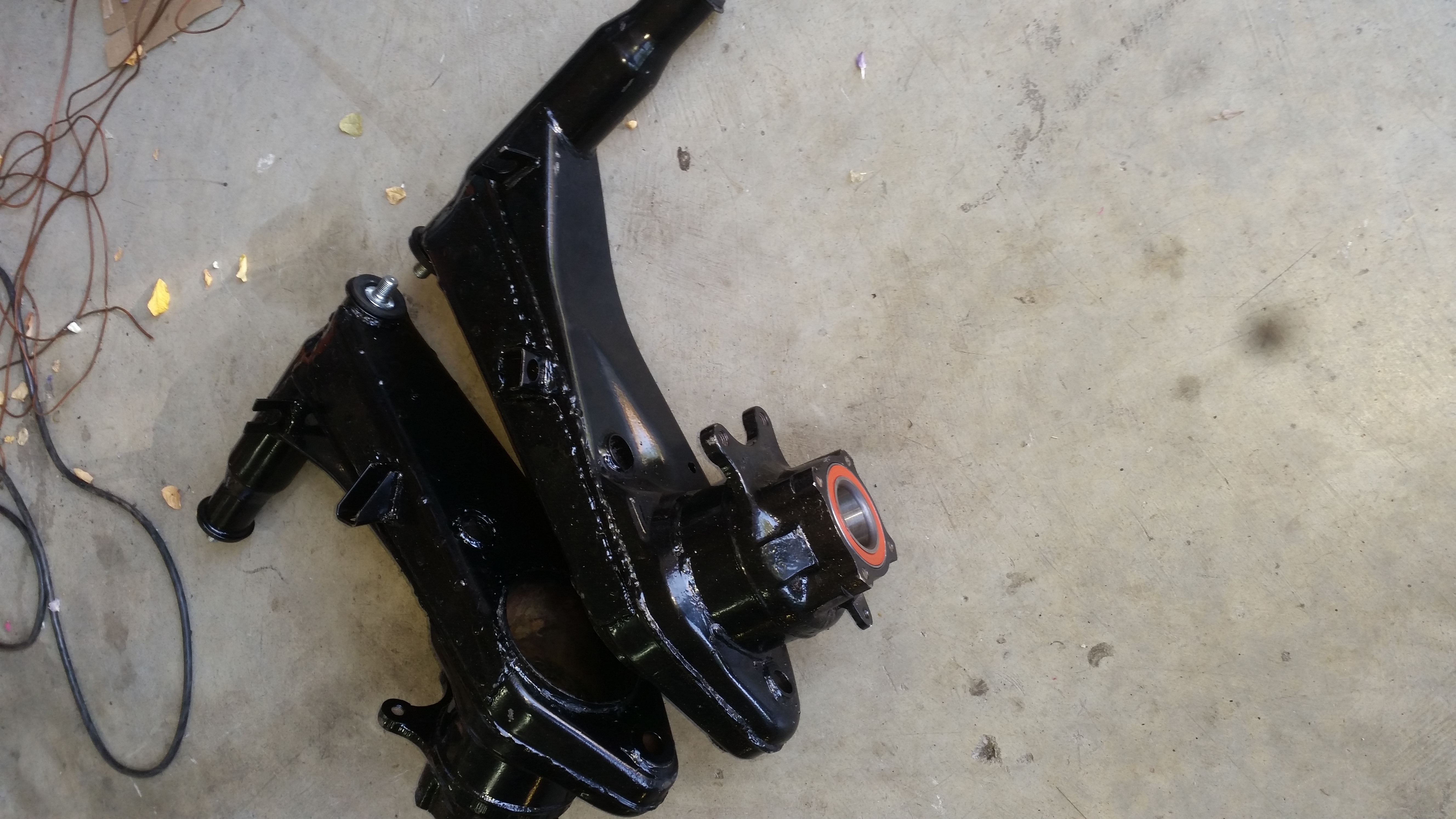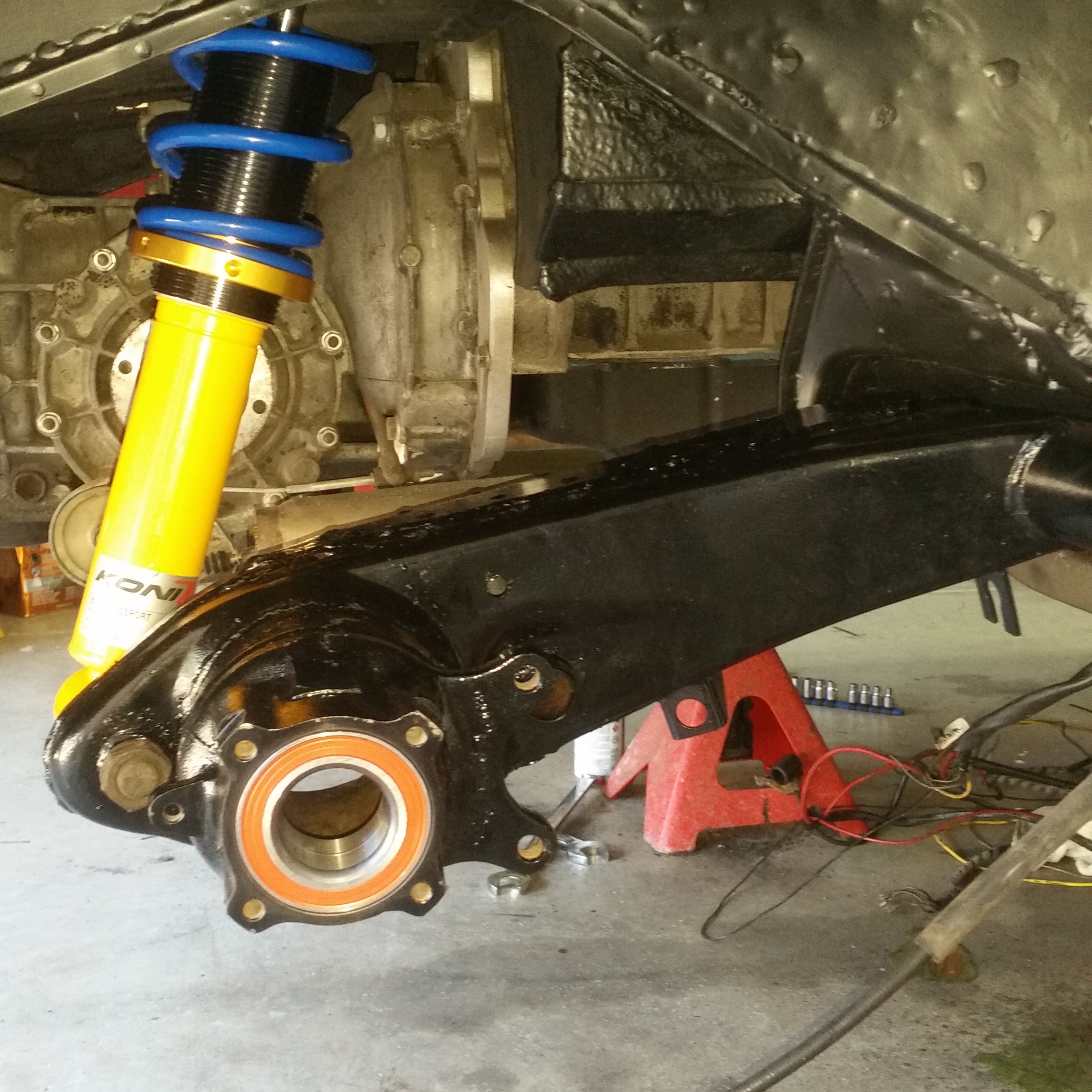 I had a busy weekend of exciting rust bucket work... I got the rear rust work done and painted up, so I decided to take a brake for a couple of minutes and start assembling some of the pretty bits. First step was installing the new Elephant trailing arm bushing kit and some fresh FAG bearings (I still laugh at "FAG" every time..) into the freshly powder coated arms. Then I hung them with the rear Koni coilovers and 175# progressive springs