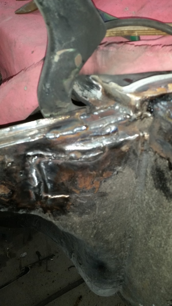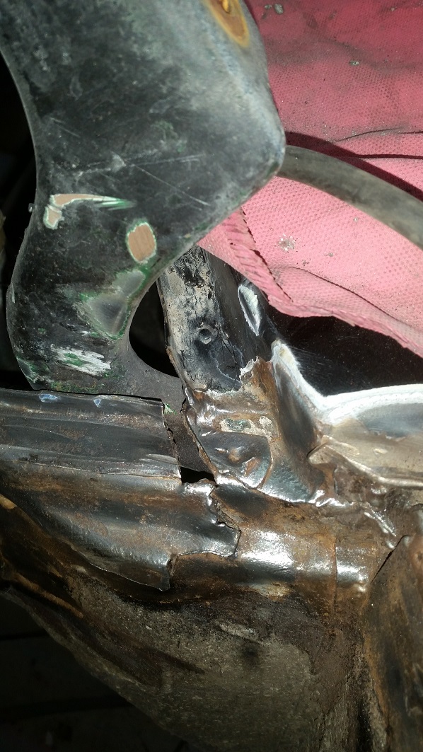 I then moved on to the front of the car and discovered some more exciting BS...I suppose that its totally OK to graft on a new (used) front end and then stop welding when you can't see or reach an area, right? I mean, I know its a unibody car, but I am sure some fiberglass resin will be strong enough to maintain integrity, right?