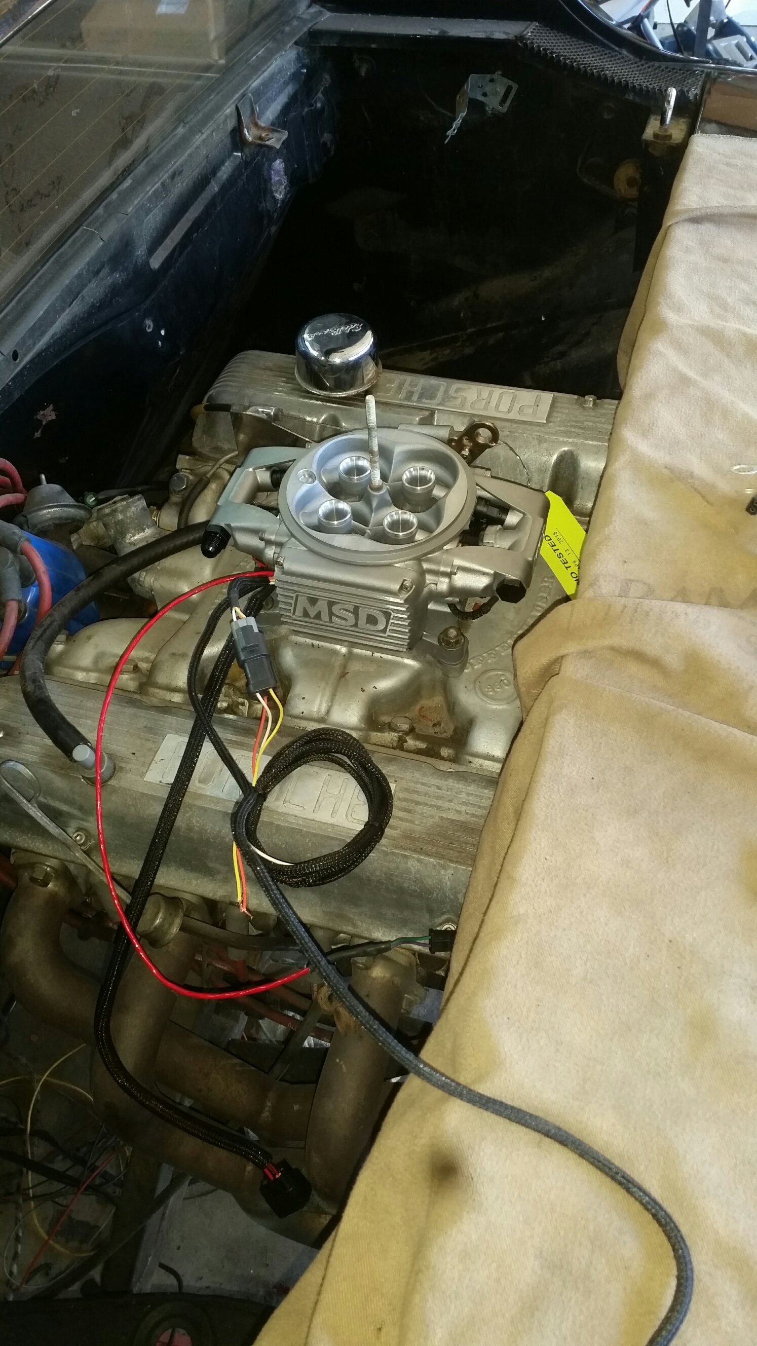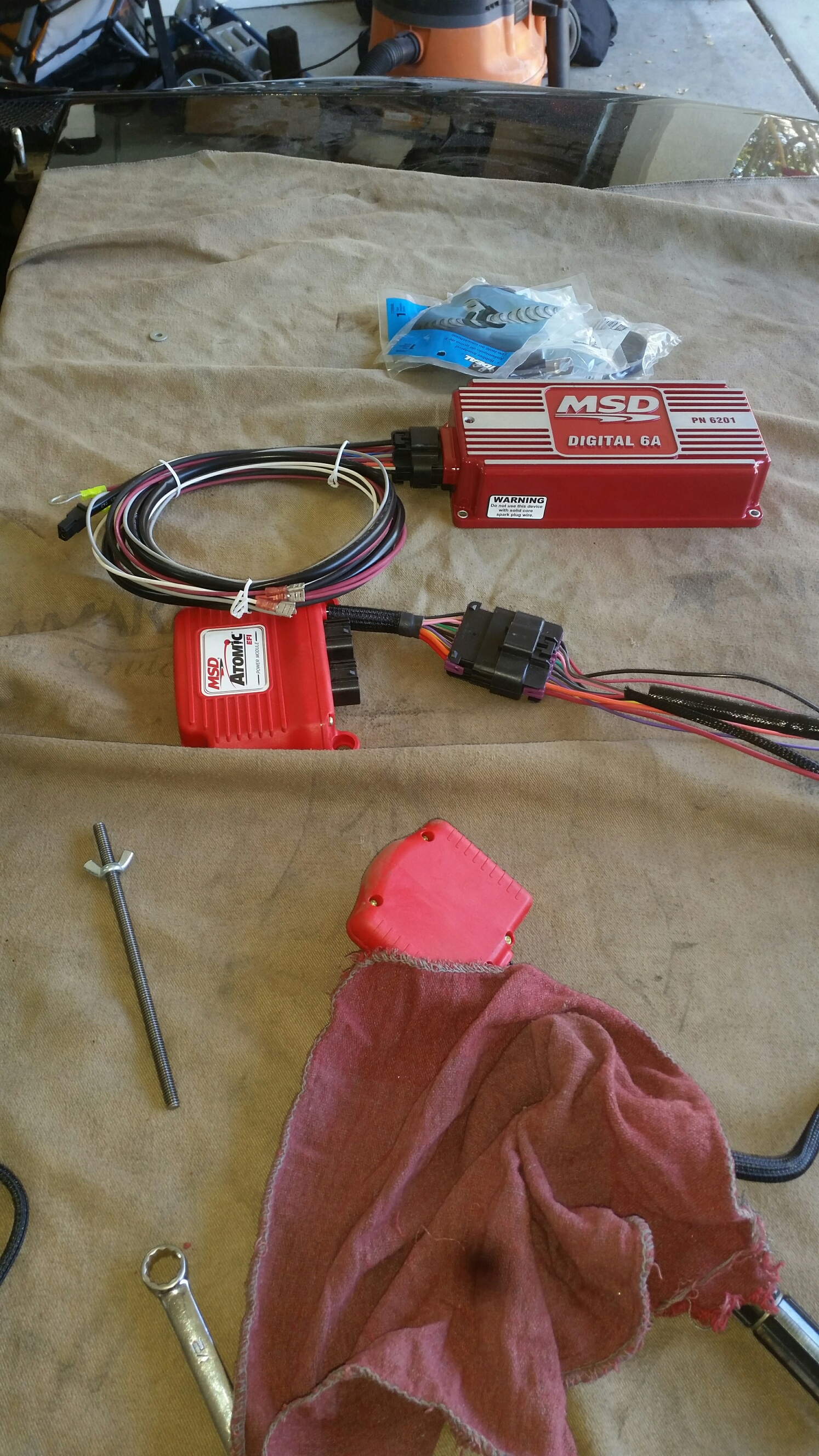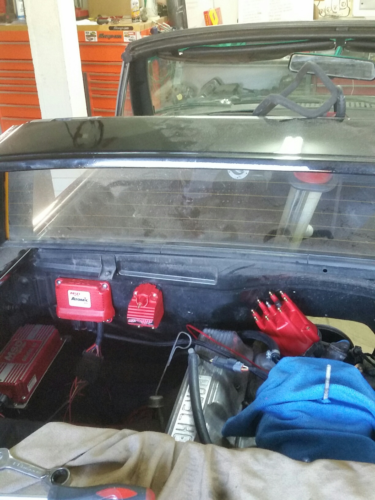 The past few days have been eventful. Got the fuel system installed, got the fuel tank back in the car. Got the Atomic EFI ECU, Coil, MSD 6a, Return Regulator and throttle body installed. Had to modify the firewall to clear the MSD Male-style cap (hooray).