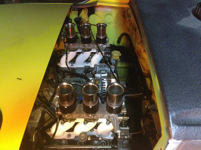 ... cool carb setup... Just to clarify, this car is actually set up for EFI. The injectors and fuel rails bolt directly to the head, and this setup is a custom job using motorcycle throttle bodies. All of the roar of Webers with all the tuning of injection! (IMG:style_emoticons/default/smile.gif) |